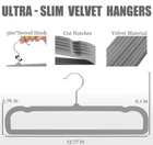Maximizes closet space:1/4" (6mm) Ultra-slim profile helps maximize closet space;Non-Slip Velvet Hangers make your wardrobe can storage more clothes Dimensions: 13.77"wide x 6.1" height x 1/4" (6mm) thick;0.144lb each Slim velvet pants hangers.Velvet slim hangers with 360°Gold swivel hook Non-slip Velvet Design:Our Non-Slip velvet slimline pants hangers made of high quality durable plastic and velvet,grips slippery sleeveless garments like dresses, tank tops Strong Bearing Capacity:It is strong and durable,each Slim Velvet Pants Hangers can hold up to 10 pounds Real Multifunctional Hanger:The Thin Space Saving Velvet Hanger can hold jeans, trousers,scarf,towel,Silk scarf,Tie etc