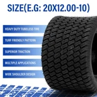 Description Specifications: 1.PLY:4 3.Tread Depth: 0.28in(7.1mm) 4.Rim width: 8.50in(215.9mm) 5.SW:11.02in(280mm) 6.OD:20in(508mm) 7.Max load:1320Lbs 8.PSI:20 Package Includes: 2 x Tires Specification: Tire Size: 20x12.00-10 4 Ply Rated, Tread Depth: 7.1mm; Rim Width: 8.5", SW: 280mm; OD: 508mm; 1320Lbs@20psi Feature: Turf Tech tread is made to give you better traction on grassy surfaces, especially on hills where the potential for slippage exists, The design will greatly reduce the damage to your lawn Compatibility: 20x12.00-10, 20x12.00x10 tires is widely used on many kind of lawn mower, riding lawn mower, lawn tractor, garden tractor, garden tractor pulling, farm equipment,various grass cutting equipment. Package Include: 2 Pack of 20"x12"-10" lawn tractor tires. Tire only - Wheel not included. NOTE: This tire has registered DOT, register compliance number: R3, And This tire CAN'T BE USED ON THE HIGH WAY,and tire speed cannot exceed 80 km/h;【 Directsale from factory & DOT APPROVED】