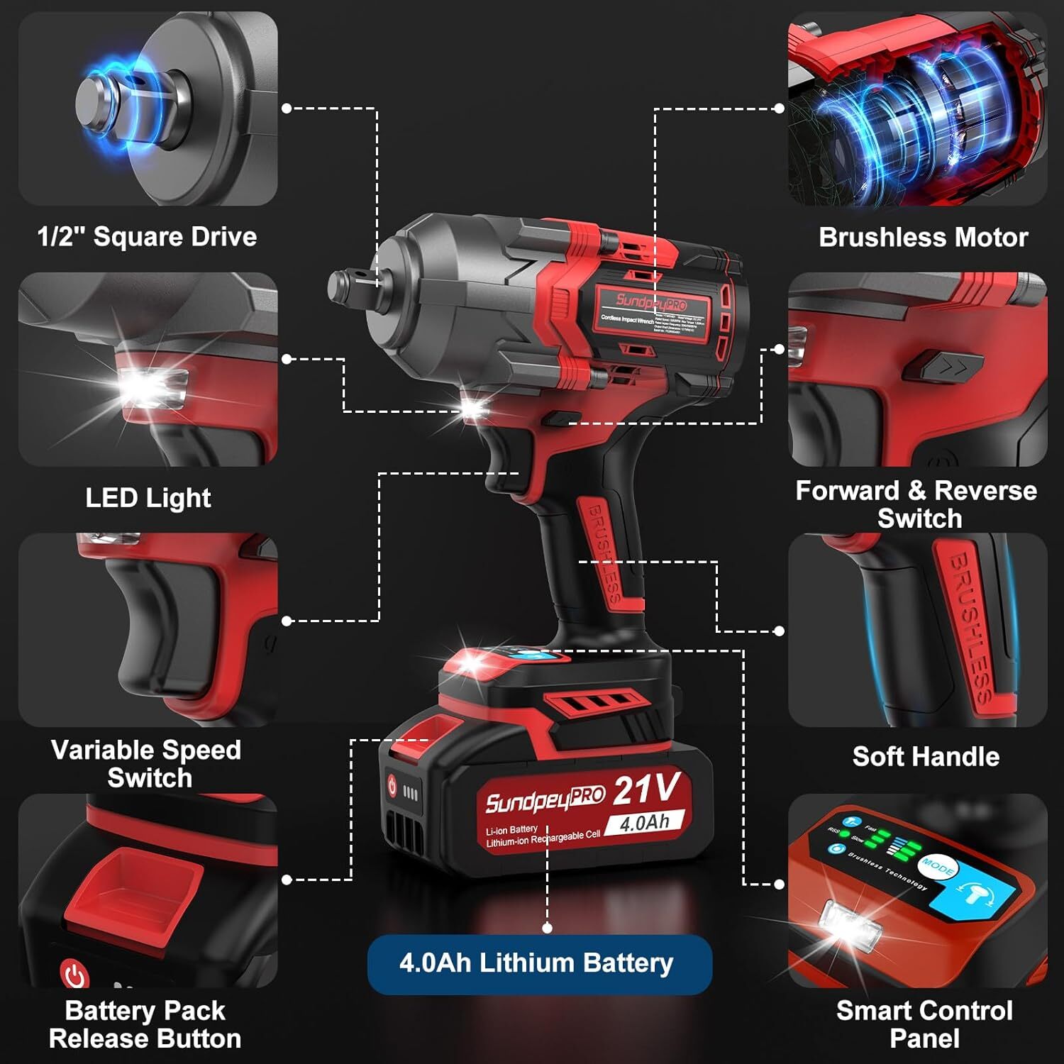 Store New Arrivals Add to Favorite View Feedback Contact Cordless Impact Wrench 900Ft-Lbs(1200N·M) - 21V 1/2" Brushless Power Impact Driver with 2 * 4.0Ah Batteries - 3200RPM High Torque Electric Impact Gun with Sockets & Fast Charger & Case Description Item Package Quantity 1 Package Quantity 1 Color Red Material Type Plastic Material Plastic Torque 1200 Newton Meters Model Number YTWRH001 Item Weight 9.5 Pounds Operation Mode Battery Head Style Round Voltage 21 Volts Finish Types Brushed 【1200N·m High Torque and Powerful Brushless Motor】SundpeyPRO cordless electric wrench has a built-in brushless motor, which provides stable operation, high efficiency and long service life. The impact wrench provide max torque 900ft-lbs(1200N·m), which can easily loosen or tighten all kinds of bolts or nuts, and is widely used in unloading car tires, automotive repair, heavy equipment maintenance, large-scale construction projects or product assembly. 【2 x 4.0Ah Batteries and Dual Protection Function】The 1/2 inch power impact gun is equipped with 2 x 4.0Ah high performance high capacity rechargeable batteries, which can provide this impact ratchet wrench with a longer use time, making your work easier, saying goodbye to the trouble of frequently replacing the batteries, and improving your work efficiency. LED power indicator, easy to check the remaining power. 【3 Variable Speed and Mode Selection】The electric impact wrench has 3 selection modes, slow, medium and fast. Adjustable speed: 800-1200RPM/1500-2200RPM/2500-3200RPM (500N·m/900N·m/1200N·m), which can meet your needs in different occasions and avoid damage to your work. Different working modes can be switched by adjusting the control switch on the side, selecting the positive clockwise forward switch and pulling the trigger. Tool speed can also be increased by increasing the pressure of the switch trigger. 【Bi-directional and Premium Brake Stop Mode】The electric wrench has locking protection, forward and reverse modes for clockwise and counterclockwise rotation by adjusting the direction switch. In reverse mode, add the RSS button to turn on the reverse self-stop mode, once the nut or bolt is loosened, the brake stop will activate and reduce the speed and torque to protect the nut from flying to nowhere to grab. 【Built-in 2 LED Lights】The pistola de impacto has 2 built-in LED work lights that greatly improve visibility, making it a convenient tool for quickly and easily removing bolts and nuts in tight and dark environments. It not only illuminates dimly lit work areas, but also helps professionals or non-professionals to accurately identify the work location and perform their work. 【Thoughtful Design and Suitable for Multiple Scenarios】The power impact wrench weighs 5.5 pounds and can be easily operated with one hand. The compact design of the cordless impact gun features an ergonomic design and non-slip rubber grips for a comfortable grip and reduced hand fatigue. Every accessory are stored in a sturdy tool case, which is portable, but also prevents accessories from getting lost. SundpeyPRO 3-in-1 multi-functional cordless impact can also be used as an impact drill and screwdriver, it is suitable for different working environments. (Drill and screwdriver are not included in the accessory) 【Package Content and Friendly Service】The package of llave de impacto included: 1 x Impact Wrench, 2 x 4.0Ah Li-ion Batteries, 1 x Charger, 5 x Impact Wrench Sockets(17mm, 19mm, 21mm, 22mm, 24mm), 1 x Extension Pole, 1 x Tool Box, 1 x User's Manual. SundpeyPRO offers a 12-month friendly customer support to keep you out of trouble. If you have any other questions, please let us know and we will do our best to solve your problems. Product Description 1 Brushless Motor 2 2 * 4.0Ah Batteries Two Rotary Modes & Three Speeds Control & RSS Reverse Self-stop Function Powerful brushless motor delivers up to 900Ft-lbs(1200N.m) of torque and 3200 RPM, you can use it in multiple scenarios to handle various kinds of work. 21V High Torque Impact Wrench Easily Help You with Multi-scene Works. Start Your Repair Work with SundpeyPRO Cordless Impact Wrench! Our portable and comfortable cordless impact gun can better improve the working efficiency, allowing you to do more work with less electric energy and run for a longer time. ABOUT US We offer the best prices around on high quality products. Our E-store includes media such as books, movies, music and games while offering electronics, toys, sporting apparel, clothing, tools, general home, garden items and more. SHIPPING We are always working hard to ensure your package arrives as soon as possible. Please understand that some factors like weather, high postal traffic, and the performance of shipping companies are outside of our control. We offer free shipping to the lower 48 states and ship within 2 business days of payment, usually sooner. We do not accept P.O. Boxes. Please provide a physical address. For shipping outside of the continental USA, we only use eBay's Global Shipping Program.The item is shipped to KY and then sent to the rest of the world. International customers are responsible for all duties and taxes. Continue to check out in order to calculate costs for shipping the item to your country. Messages regarding eBay's Global Shipping Program MUST be directed at eBay EXCLUSIVELY. RETURNS We offer a 30-Day Return Policy on items which you are not completely satisfied with. You have the option for a full-refund or an exchange of the item. No returns are available on items shipped outside of the USA. PAYMENT We accept PayPal. CONTACT US This page content is yet to come Please ad us to your favorite seller and visit again later Thank You CUSTOMER SATISFACTION We try our very best to make sure every customer is completely satisfied. If there's a problem, message us! We're happy to help. WE ACCEPT Copyright © 2021 AutoDS. | All Rights Reserved