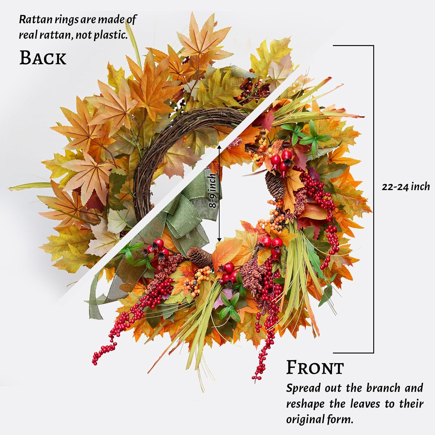 【Vibrant & Lifelike Fall Door Wreath】This 24 inch autumn wreaths for front door is filled with lifelike autumn leaves in warm tones, red berries, pine cones, and a charming green bow. It adds a stunning seasonal touch to your front door decor 【Premium Materials & Full Shape】 Outdoor fall wreath crafted with premium silk flowers, sponge berries, professional flower paper, and a sturdy natural vine base, this fall door wreath is lush, well-shaped, and long-lasting. No sparse spots—just full autumn beauty 【Handcrafted Fall Outdoor Wreath】Our fall front door wreath is professionally handcrafted by skilled florists. With detailed craftsmanship and solid construction, this wreath fall decoration will last year after year,not easy to fall off 【Perfect for Indoor & Outdoor Use】Use it as a fall wreaths for indoors, on your wall, fireplace, kitchen, or window, or as an outdoor fall wreath for your porch or front door. Ideal for Thanksgiving, Halloween, Harvest Day, and other seasonal events 【Easy Setup & Adjustable Design】Arrives in a sturdy box to protect the shape. Gently fluff the fall eucalyptus wreath upon arrival to reveal its full 24-inch diameter. Instruction card included for best display tips 【Thoughtful Seasonal Gift】This large fall wreath makes a beautiful gift for housewarming, autumn weddings, or Thanksgiving front porch decor. It's the perfect way to share festive spirit and warmth 【Worry-Free Service】Artificial silk fall wreaths for indoors don't need special cleaning, just wipe them with a dry cloth to keep them clean.Any problem in the process of use, please contact us in time, we will give you a satisfactory answer at the first time Product Description