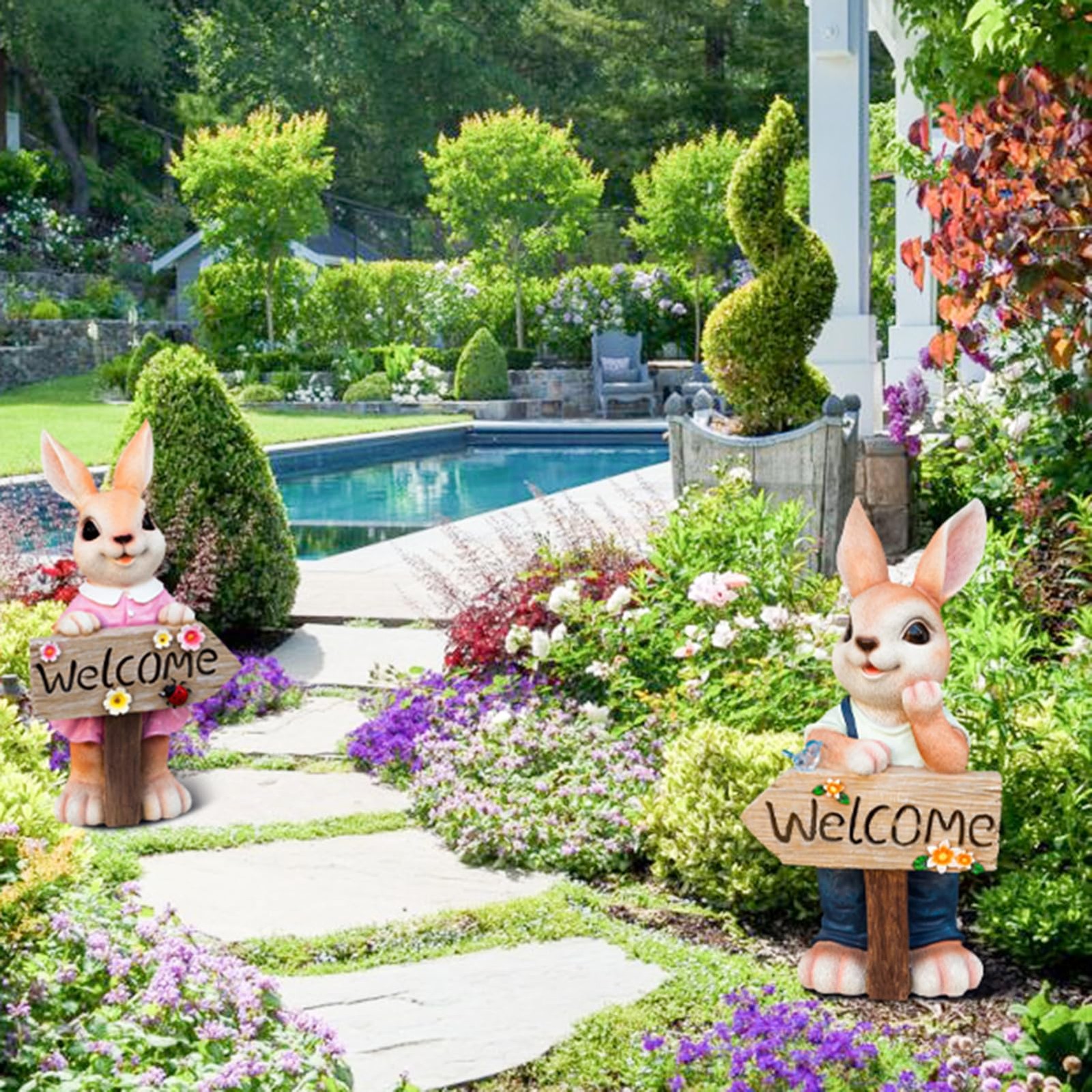 Features of Product: (1). Solar Large Rabbit Statue is made of durable waterproof resin,and coated with UV resistant coating. It can withstand changing weather conditions without cracking and fading. (2).This charming standing rabbit outdoor statues measure approx 13.8"Lx10.4W"22"H. Place in your garden, lawn , backyard, terrace, patio or front porch. (3). This standing rabbit statue features lifelike details and bright penetrating eyes, eye-catching welcome sign directions arrow under the rabbit, show your guest the most enthusiastic welcome and tell them “this way please”. The rabbit garden staute will surely catch all the intentions of your visitors at first sight. 【Unique Design】This standing rabbit statue features lifelike details and bright penetrating eyes, eye-catching welcome sign directions arrow under the rabbit, show your guest the most enthusiastic welcome and tell them “this way please”. The rabbit garden staute will surely catch all the intentions of your visitors at first sight. 【Garden Decor】This charming rabbit outdoor statue measure is 13.8 x10.4 x 22 inches. Place in your garden, lawn , backyard, terrace, patio or front porch. This cute bunny looks very lifelike and it can give your guests a spring feeling, get more easter atmosphere and express your love for life. 【Premium Quality】The large rabbit statue is made of durable waterproof resin,and coated with UV resistant coating. It can withstand changing weather conditions without cracking and fading. 【Solar Powered】This solar bunny statue is equipped with a solar panel. Simply turn the switch to the "ON" position before use,the solar panel will charge in the sunlight hours,automatically turns on at dusk and off at dawn. 【Unique Garden Gifts】As the mascot of Easter, the rabbit symbolizes the revival of spring and the birth of new life. Perfect Easter gifts for your friends and relatives to decor their home and Easter party.