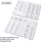Separate and Stackable - These sturdy desk drawer organizer set can be stacked together, or each one works alone. The interlocking feature of the junk drawer organizer help you create your own mix.Keep everything organized, No more trouble finding things. Durable Material - These shallow drawer organizers are made of high-quality and solid durable plastic material.Drawer organizer bins are break-resistant and could accommodate different items and match organizational system to fit in any drawer. Multi-purpose drawer organizer tray - Designed for multipurpose solutions, perfect for dresser, bathroom drawer, kitchen drawer, office desk etc.Cosmetics, brushes, daily necessities, tableware, fruits, jewelry, tools, pencils can be easily stored. Easy to Care - Rounded corners plastic drawer organizer allow for easy use and cleaning.You could wipe clean with soap and sponge when it is dirty.The drawers can be stored permanently. Customize Combination - 22 pack flexible small drawer organizer with 3 various sizes allow for a good variety of layout. Items are organized according to size and use. contains 12pcs Small:(2.9×2.9×1.9 inch) - 7.5×7.5×4.8 cm,8pcs Medium:(9×2.9×1.9 inch)- 23.5×7.5×4.8cm,2pcs Large:(9×6×1.9 inch)-23.5×15.5×4.8cm. Product Description This desk drawer organizer set is perfect for dresser, bathroom drawer, kitchen drawer, office desk etc.Keep everything organized, No more trouble finding things.