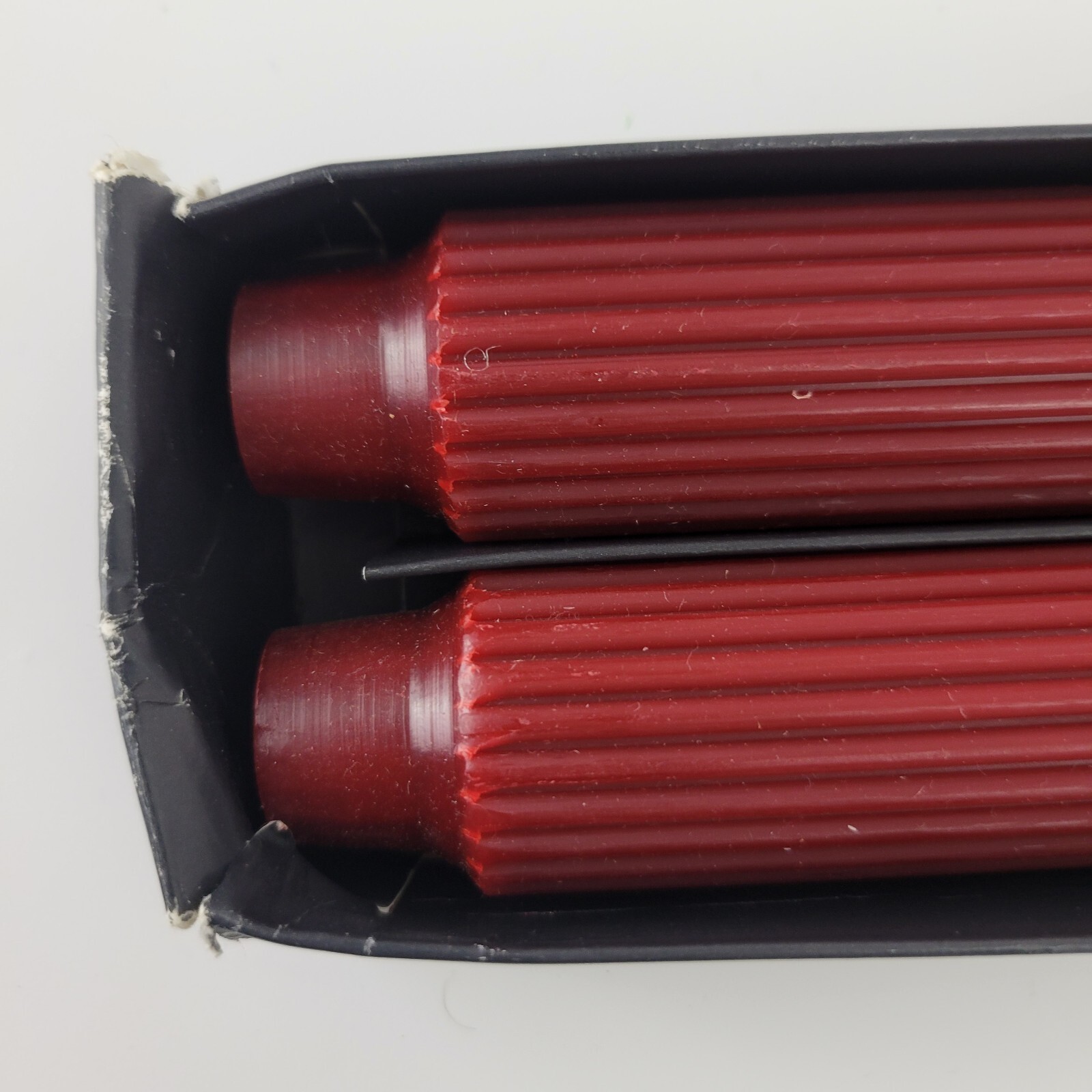 This pair of vintage candles is new in the original box. The box itself has a fair amount of handling wear, and there are a few minor dents to the ribs. Please see pictures for close ups of those spots. Each candle measures 24" x 1.25". Per the package, the burn time averages to 2.5 hours per inch. Note that at the time of listing, I have another pair of this size candles that are ivory. If you do want to purchase both, please let me know before paying so I can combine shipping for you.