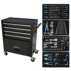 Product Features The metal storage cabinet comes with four wheels, two of which have parking brakes, so you can move the cabinet around freely or park in one place. The opening and closing of the drawers of the tool cabinet is very gentle thanks to the ball-bearing drawers. The storage surface provides additional space for storing and arranging tools you often need. The robust and powder-coated steel construction is used for high wear resistance. Description One Side with Pull Handle This product comes with a handle on one side, which not only helps to push and pull it more, but allows you to move it more freely 4 Drawers with Wheels Drawers can easily accommodate needed items such as folders, notebooks, tools, etc. 2PCS with Brake and 2PCS without Brake With swivel casters could maneuver easily around work area. The wheels have locking mechanisms to prevent the tool cabinet from moving around on its own while in use. Tool Set Four drawers with assorted tool sets Product Information Product Name 4 Drawers Tool Cabinet with Tool Sets Material Cold Rolled Steel Surface Finish Powder Coating Casters 4" Casters (2PCS with brake and 2PCS without brake) Size 24.25*13*29.33 Package Size 28.86*27*15.18 Color Black Net Weight 19KG Gross Weight 21KG