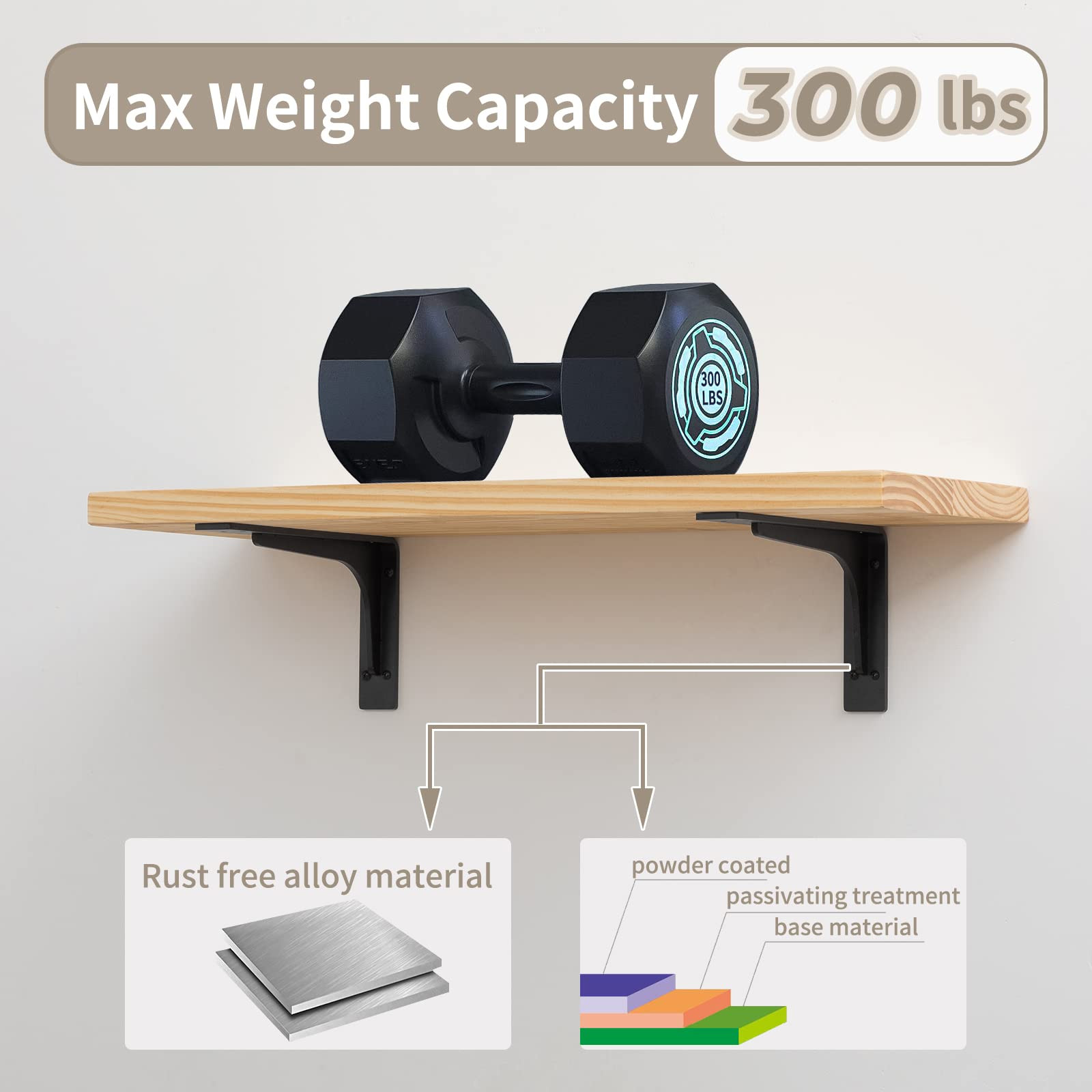 24 INCH x 14.2 INCH shelf brackets,L Shelf Brackets,Rustic Industrial Shelf Brackets with Modern Finish,premium alloy metal heavy duty shelf bracket, Countertop Support Brackets,high strength Mounting Hardware Included, Easy Installation, Pack of 2. 【meaurement】24 x 14.2 inch shelf bracket, apply to 24 inch to 30 inch deep shelf. (board is NOT included) 【perpendicularity】 The brackets are 100% perfect 90-degree vertical angle. 【LOAD 】The Specially made alloy metal material is lighter but stronger than the others on the market. It has greater load- bearing capacity, It can hold up to 320 pounds each pair , 280 pounds is the best weight bearing effect 【powder coating finished】 Matte black coated finish ,durable and sturdiness. L bracket comes with traditional matte black,It fits in perfectly in your farmhouse kitchen, garage, basement storage room, and backyard. 【Complimentary PACK】G5 high strength screws ,screws and anchors are for hard walls. (dry wall anchors not provide) Following the steps properly, put your Pre-prepared lumber board on, you will get your perfect and stable floating shelves.
