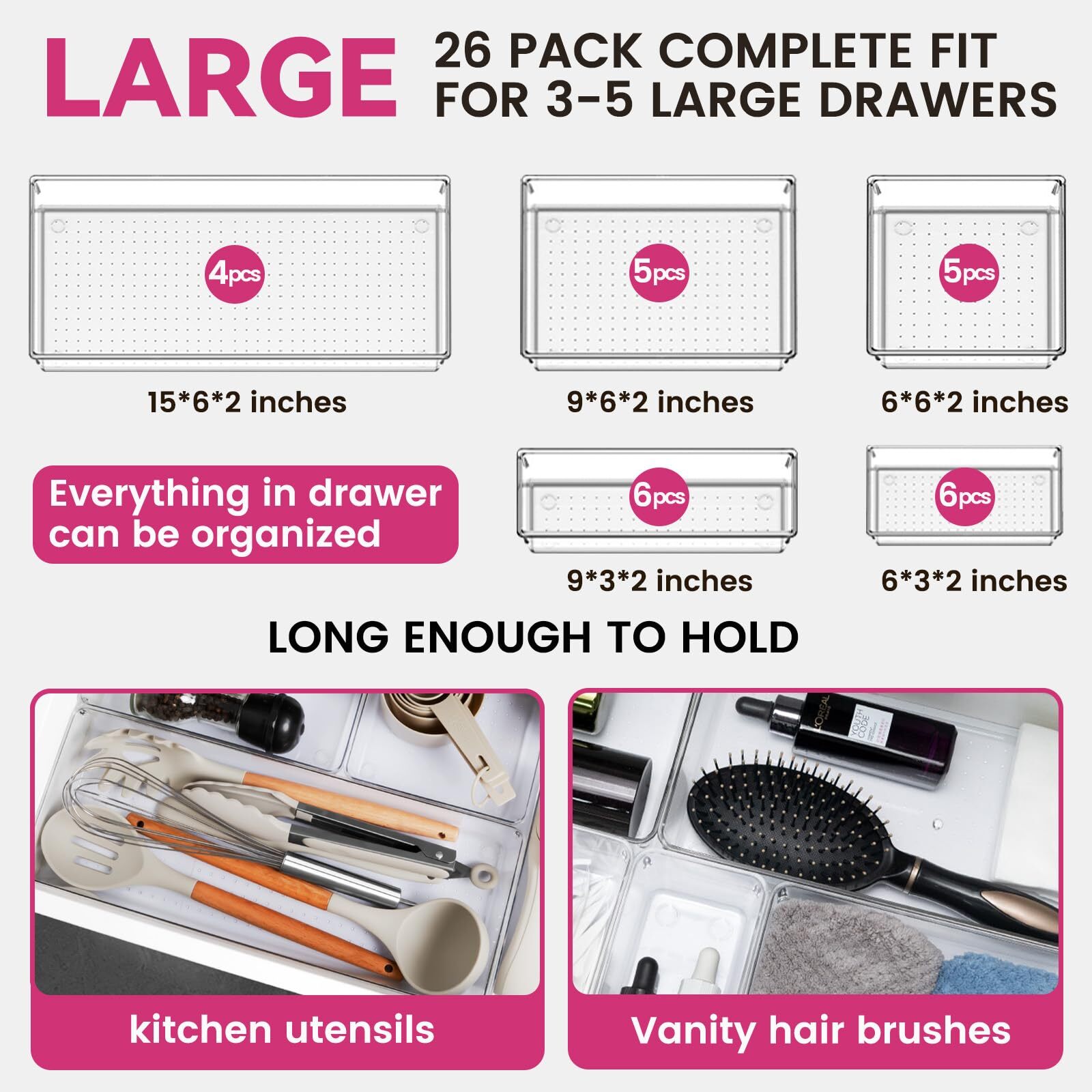 【LARGER SIZES】With 5 different sizes, our 26 pack clear drawer organizers could hold more gadgets, large and long enough to hold kitchen utensils, silverware, household tools and more. Includes: 4 pack large drawer organizer trays 15x6x2 inches, 5 pack 9x6x2 inches, 5 pack 6x6x2 inches, 6 pack 6x3x2 inches, 6 pack 9*3x2 inches. 【FOOD-GRADE QUALITY】Crafted from premium PET plastic, our desk drawer organizers are twice as sturdy as other fragile ones, and resistant to cracks and scratches. No smells, and safe as food storage, refrigerator pantry organizers and storage. (If quality fails, we'll provide you with a new complete set.) 【MULTI-USE】Measuring 2 inches high, these makeup drawer organizer for vanity could fit with all kinds of drawers, such as vanity/bathroom/kitchen/office drawers/ craft room, ideal for organizing cosmetics, makeup tools, hair accessories, jewelry, pins, office supply, craft supplies, utensils, etc. 【STACKABLE AND NON-SLIP】Our bathroom drawer organizer trays boast a wider base which means more storage space. Stack these organizers into one another to maximize the use of your drawer organization and storage space. The bonus silicone non-slip pads keep these organizing bins firmly in place when the drawer is suddenly opened or closed. 【MAINTAIN TIPS】 Our kitchen drawer organizers and storage bins are easy to wipe clean with a damp cloth, ensuring they stay crystal clear and crack-free for years of use. (Do not put into dishwasher.)