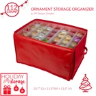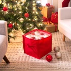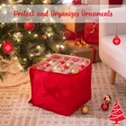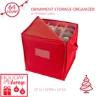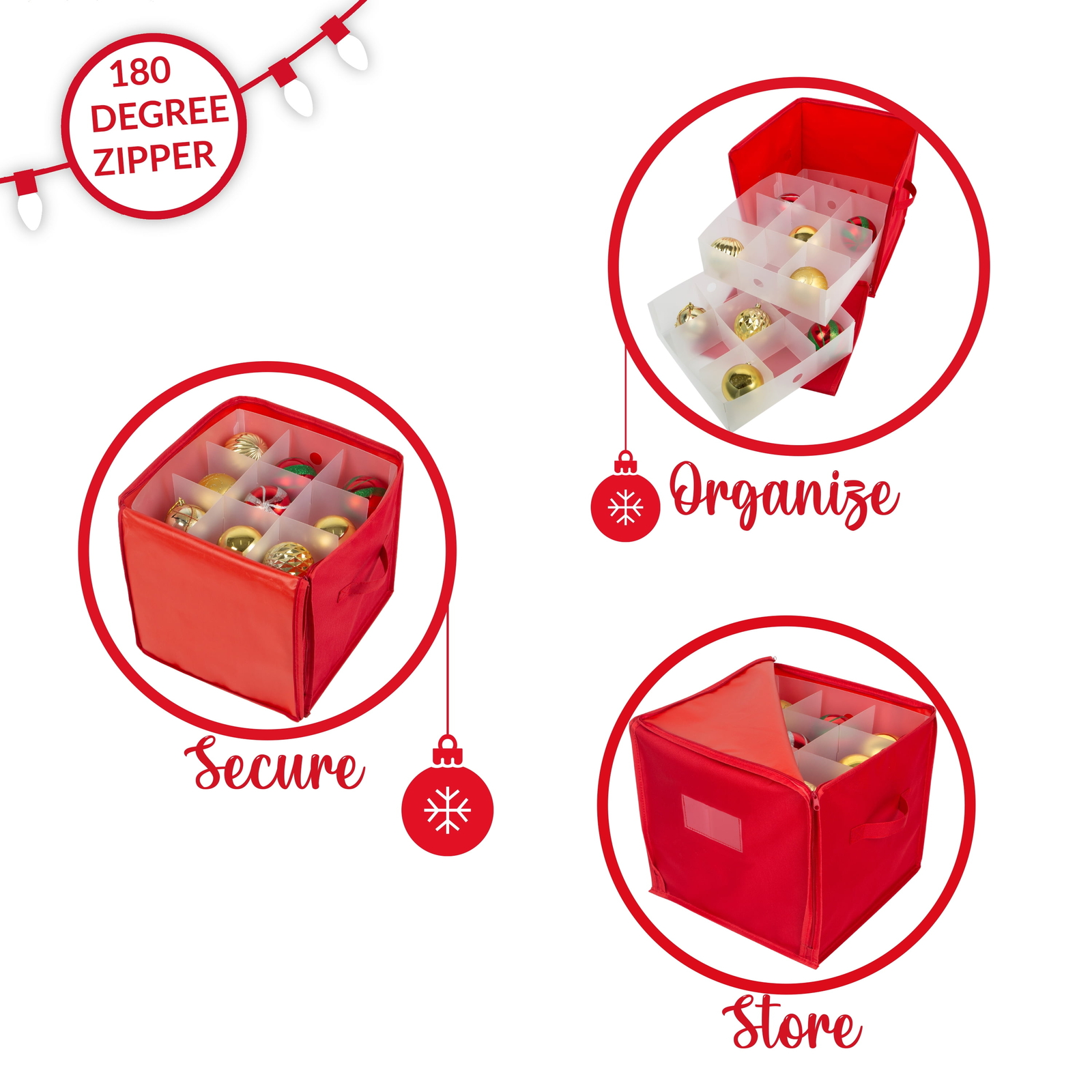 This 27-Count Polyester Ornament Organizer is a perfect Christmas or holiday accessory to keep around the home! Helps keep up to 27 ornaments safely stowed away until the next holiday season! The stackable design with Velcro fasteners keeps storage boxes in place. Comes with handles for easy carrying and a zipper-lid closure for protection. Supportive clear dividers help protect and organize ornaments up to 4" wide each. Safely stow away your precious ornaments until next holiday season. 27 Count Stackable Christmas Ornament Storage Box, Red Dimensions: 12"x 12"x 12" Comes in red finish Protects and organizes Christmas or holiday ornaments during the off-holiday season Easy-carry handles for transport Fits ornaments up to 4 in. diameter Supportive stacking dividers included 180 degree zipper for ease of use Stackable design with Velcro fasteners to help keep storage boxes in place Clear divider trays make ornaments easy to view and carry