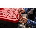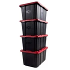 27 Gal. Black Storage Totes with Red Lids (4-Pack) Heavy Duty About This Product This 27-gallon heavy-duty storage tote is built to handle tough storage jobs at home or on the jobsite. The strong black base is made from durable resin, while the red snap-on lid keeps contents secure. Totes are stackable with a recessed lid and nest easily when empty to save space. Integrated tie-down channels make transporting safe and easy, and locking slots provide added security. The gallon size is clearly marked on both the base and lid for quick identification. Perfect for bulk storage, moving, or organizing garages, closets, and more. Highlights 4-pack of 27-gallon heavy-duty storage totes Snap-on red lids with lockable zip tie/padlock holes Tie-down channels for secure transport Stackable and nestable design for space-saving storage Made of durable plastic resin with ergonomic carry handles Holds up to 75 lbs. per tote External size: 28.6" L x 19.6" W x 15.2" H Internal bottom size: 22.98" L x 14.02" W x 14.30" H Tote weight: 6.1 lbs. (empty) Ideal for garages, moving, pantries, offices, and more Shipping Policy FREE SHIPPING within the 48 states! We do not ship to Alaska, Hawaii, Puerto Rico, Guam, Virgin Islands. We do not ship to APO/FPO/DPO addresses and P.O. BOXES - please provide a physical address! Your order will be processed within 3-5 business days once the payment has been received. Standard shipping typically takes 3-10 business days depending on the item. We do not offer combined shipping services. Return Policy We offer a 30-Days Return Policy on items which are damaged in transit or defective products from the manufacturer. You have the option of a full refund or an exchange of the item. All returns must be in its original condition as when it was received (include all of the original accessories or items that came with it). Feedback & Contact Us Customer satisfaction is very important to us. If you have any problem with your order, please contact us and we will do our best to make you satisfied. If you have any queries, please contact us via eBay. We usually respond within 24 hours on weekdays. Thank you for shopping with us!