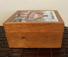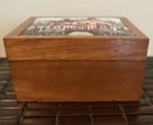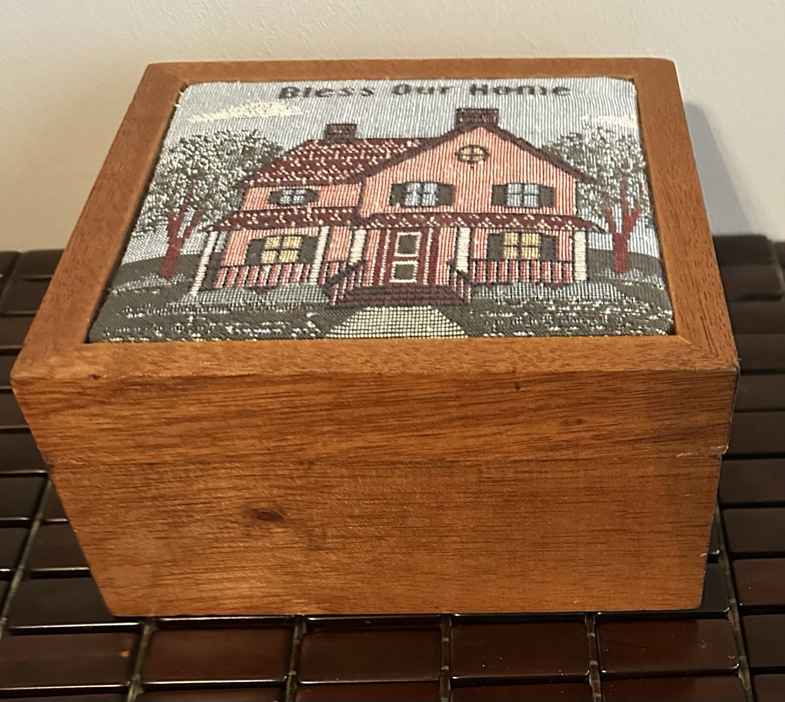 This beautiful vintage square storage box features a tapestry top with the inscription "Bless Our Home." Made of wood in the United States. In great pre owned condition.