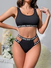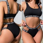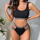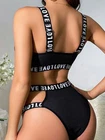 About this item: 2 piece letter tape lingerie set for women Fabric: Fabric is very stretch, and it's soft and comfortable Feature: 2 piece set, letter print, low rise, cheeky panty, womens lingerie, fashionable Occasion: Underwear, nightwear. Suit for wedding night, honeymoon, valentine's day, everyday, etc
