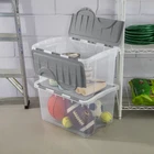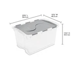 The 48 Quart Hinged Lid Storage Box is a versatile all-purpose solution for household storage needs. The attached hinged lid allows for easy access to contents and will not be misplaced when opened. Integrated, contoured handles provide a comfortable grip for transporting. Organize and store away sporting equipment, gardening supplies, or seasonal items in the basement or garage, or bedding and clothing in closets and attics. Contents can be identified through the clear base, making them easy to locate and quick and convenient to identify. The recessed lids provide secure stacking to maximize vertical storage space. The overall assembled dimensions of this item are 22 3/8" L x 15 7/8" W x 13 1/8" H. Adult Plastic 48 Qt. Hinged Lid Storage Box Titanium: Outside Dimensions: 22 3/8" x 15 7/8" x 13 1/8" The 48 Qt Hinged Lid Box is ideal for sporting equipment, gardening supplies, bedding Single unit option Clear base allows for contents to be viewed at a glance - Titanium Interior Dimensions at bottom: 18 5/8" x 13 1/8" x 11 3/8" Versatile all-purpose solution, ideal for household storage needs Clear base allows for contents to be viewed at a glance and easy to find Hinged lid allows for easy access to contents and ensures that the cover is never misplaced The recessed lid allows for secure stacking to maximize storage space BPA-free and phthalate-free