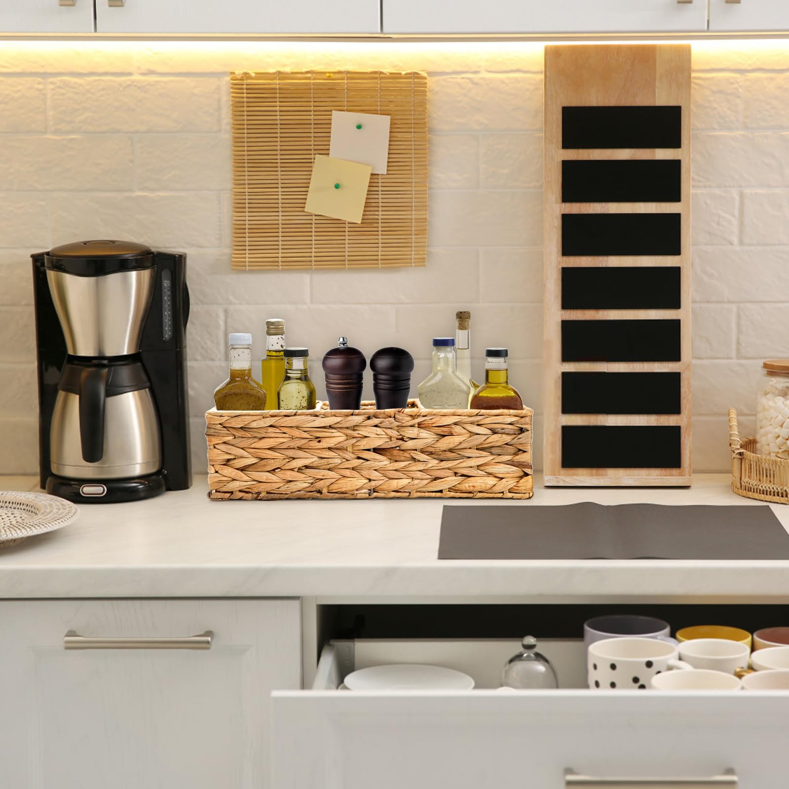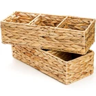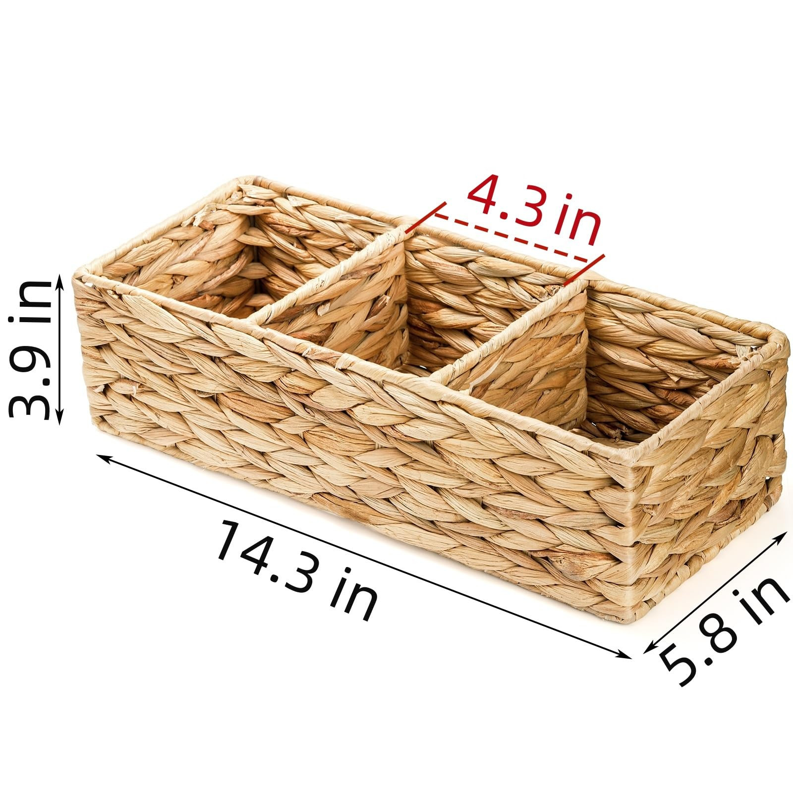 Value Pack: You will receive 2 pack wicker baskets, enough quantity for replacement or satisfying you and your family's daily use. Each measures 14.3"L x 5.8"W x 3.9" H, a perfect size for storage and using. This water hyacinth basket can make your home more clean and tidy. High Quality: 3-section storage bin is made of natural water hyacinth in a woven pattern, sturdy and durable. This wicker basket is constructed with a sturdy iron frame inside for easy long-term use. Divided Compartment: Our handwoven desk organizer features 3 equally divided sections, helping you classify and organize different items. You can divide your stuffs according to different functions, which is very convenient and clearly. Versatile Usage: This rectangular countertop holder can not only be used in the bathroom. It is also great for kitchen, shelves, coffee bar, pantry, office. You can use it to organize toilet paper, towels, tissues, snacks, toys, personal care, stationery supplies and more. Ideal Choice: Our water hyacinth baskets are all original hand-made masterpieces, bringing a natural vibrancy to your home and making it warm and welcoming. And it gives people a rustic and chic feeling, which can be used as a decoration or a perfect gift for your family and friends.