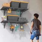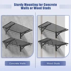 Garage Shelving HEAVY-DUTY GARAGE SHELVING: Our 2-Pack wall-mounted shelves provide generous storage, featuring two 2'x4' shelves per unit. Built from heavy-duty steel, each shelf holds up to 200 lbs, offering a combined capacity of 400 lbs. Ideal for garages, warehouses, offices, and beyond, these shelves are designed for durability, stability, and efficient space organization PREMIUM STRENGTH & STABILITY: Engineered with heavy-duty steel, our wall shelf system features reinforced square tube supports, a seamless integrated frame, and secure U-hooks for superior durability. Every component undergoes rigorous quality testing to ensure maximum safety and long-lasting performance VERSATILE STORAGE HOOKS: Designed with 2 large and 6 small hooks, this shelving system provides flexible hanging space below the shelves. Perfect for organizing garden tools, sports gear, extension cords, toolboxes, cleaning supplies, bikes, and seasonal decorations with ease EASY TO INSTALL: Designed for hassle-free setup, our wall shelf system includes an Installation Template, Bubble Level, and step-by-step guide for one-person assembly. All necessary hardware is provided for quick, secure, and precise installation on wood studs or solid walls (concrete/brick). Note: Not suitable for metal walls. WORRY-FREE PURCHASE: Backed by 24/7 customer support. For brick or concrete walls, use expansion anchors for secure mounting. Our dedicated team is here to assist with any questions.