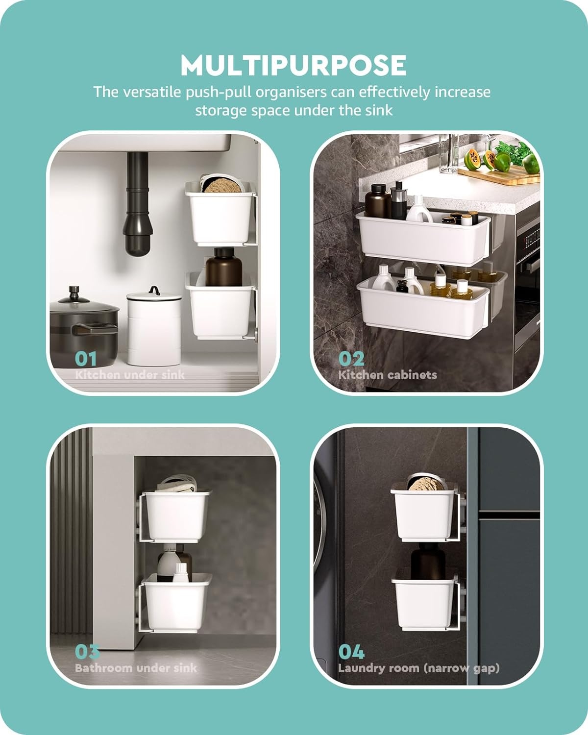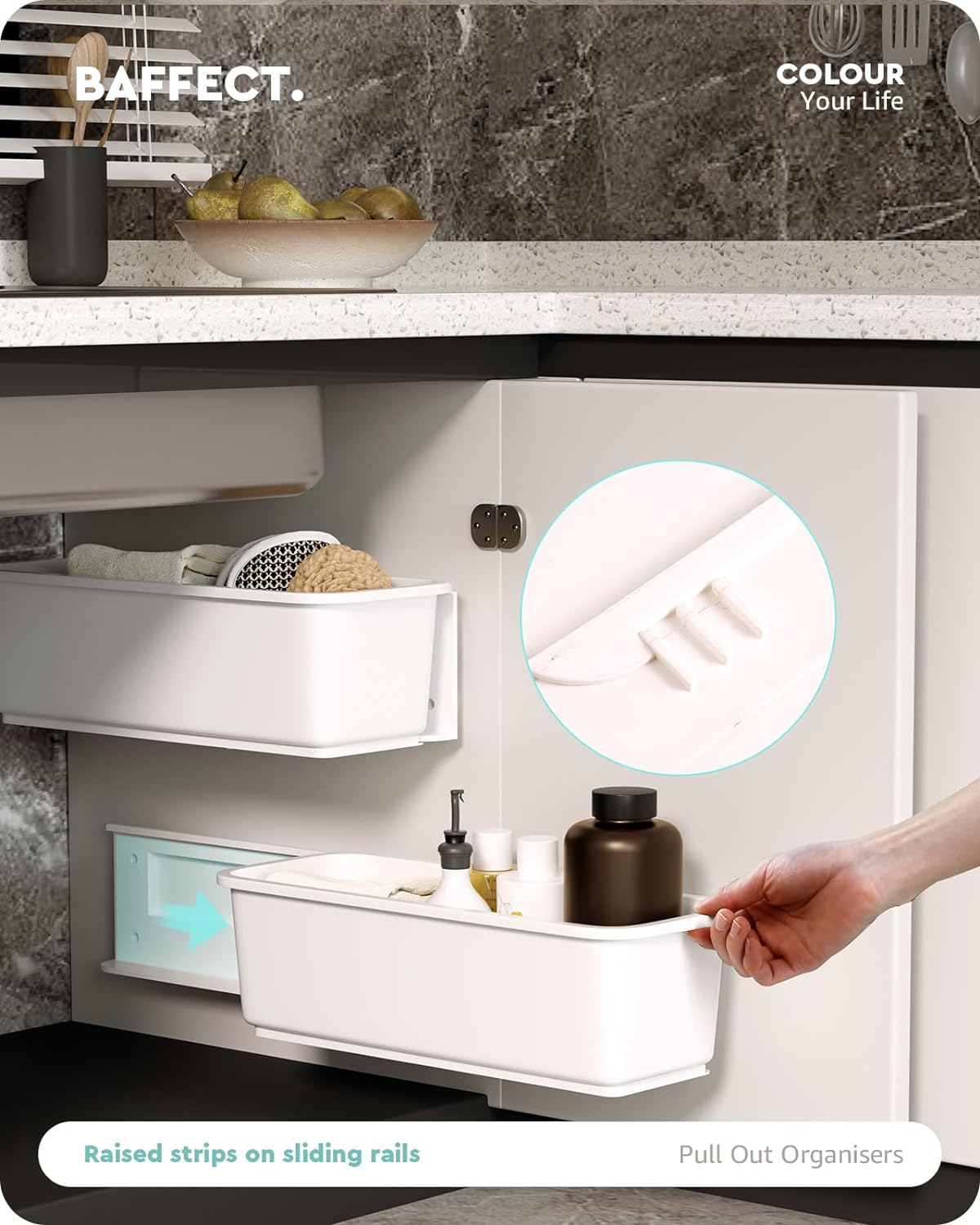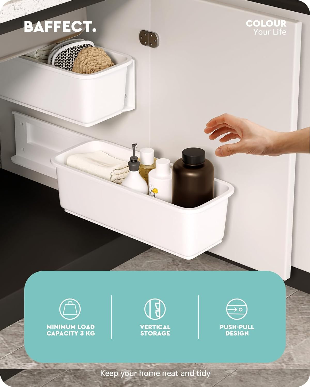 Store New Arrivals Add to Favorite View Feedback Contact 2 Pcs under Sink Organizers Pull Out Cabinet Organizer Slide Out Plastic Storage Drawers Sliding Basket for Kitchen Bathroom Undersink (White) Description Item model number HM-BF22511 Capacity 5 Kilograms Number of Items 2 Color White Finish Type Polished Product Dimensions 5.98"D x 14.8"W x 4.41"H Material Plastic Country of Origin China Maximum Weight Recommendation 421 Grams Specific Uses For Product Sinks Item Weight 14.9 ounces Shape Rectangular Package Type Standard Packaging Mounting Type Wall Mount Item Weight 421 Grams Special Feature Push-pull & Wall-mounted Design Number of Compartments 1 Unit Count 2 Count Vertical storage - These wall-mounted kitchen organisers allow you to store daily items vertically, making effective use of the free space under the sink. There are two separate cabinet organisers for each set, free to be installed in combination to meet your different storage needs. Strong load-bearing capacity - This set of 2 cupboard organisers come with different mounting accessories, including quality adhesive tapes and screws. With an upgraded and larger one-piece adhesive tape, each cupboard organiser will be mounted more securely to hold a weight around 3 kg. To increase its stability and support a weight of approximately 5 kg, you can mount each organiser by screwing. Raised strips on sliding rails - Each push-pull storage basket is matched to a sliding rail. And the raised design at the bottom of the sliding rail acts as a barrier to prevent the organiser from slipping out due to excessive pulling. Quality material & elegant exterior - Baffect Pull Out Organisers are made from high quality plastic with a smooth burr-free surface. Moreover, each under sink organiser features a minimalist and elegant exterior to match different home décor styles. Special note: Please ensure that the thickness of your cupboard door is no more than 2.48 cm/0.98 inches prior to purchase, as an overly thick door will prevent you from successfully pushing and pulling the kitchen organisers. Product Description Baffect Pull Out Organisers make efficient use of the space under your sink for tidiness. Baffect Organisers Adhesive mounting & drilling mounting Each push-pull drawer can hold about 3 kg through adhesive mounting and about 5 kg through drilling. Baffect Organisers Hanging drawers for vertical storage These wall-mounted sliding drawers allow full use of vertical space for storage. Baffect Organisers Sliding rails for easy access The stable sliding rails allow you to push and pull the drawers smoothly for easy access. Baffect Organisers Raised strips on sliding rails The raised design on each sliding rail keeps the basket from falling down due to excessive pulling. Baffect Organisers Free combination for use The set of 2 kitchen organisers can be freely combined and installed for different storage needs. 1 2 MOUNTING OPTIONS 2 VERTICAL STORAGE 3 SLIDING RAILS 4 RAISED DESIGN 5 FREE TO COMBINE Brand Baffect Quantity Set of 2 Individual size 37.6×15.2×11.2 cm/14.8×5.98×4.4 inches Weight 0.84 kg/1.85 lbs. Load-bearing Capacity (Each) Adhesive Installation for 3 kg, Drilling Installation for 5 kg Material Plastic Color White Installation Method Adhesive Installation, Drilling Installation Features Push-pull & Wall-mounted Design Applicable Scenarios Under Sinks, Inside Cabinets, In Narrow Gaps Will these kitchen cupboard organisers fall off easily? There's an upgraded one-piece adhesive tape for each organiser, simplifying installation and providing needed support. Please kindly scrape the air off after applying the adhesive tapes and leave the organisers for 24 hours before use. What is the load capacity of each under sink organiser? The under sink organiser is available in two types of mounting. For adhesive mounting, each under sink organiser can hold approximately 3 kg. For drilling mounting, each kitchen under sink organiser can hold approximately 5 kg. Is there anything in particular that I should be aware of before I purchase? Before purchasing, please ensure that the thickness of your cabinet door is within 2.48 cm/0.98 inches, as an overly thick door may prevent you from pushing and pulling the under sink organisers. Can I install these kitchen organisers at the hinge side of the cabinet? We recommend not to install the kitchen organisers on the hinged side of the cabinet, as it may interfere with the sliding of the drawers or the opening and closing of the cabinet door. ABOUT US We offer the best prices around on high quality products. Our E-store includes media such as books, movies, music and games while offering electronics, toys, sporting apparel, clothing, tools, general home, garden items and more. SHIPPING We are always working hard to ensure your package arrives as soon as possible. Please understand that some factors like weather, high postal traffic, and the performance of shipping companies are outside of our control. We offer free shipping to the lower 48 states and ship within 2 business days of payment, usually sooner. We do not accept P.O. Boxes. Please provide a physical address. For shipping outside of the continental USA, we only use eBay's Global Shipping Program.The item is shipped to KY and then sent to the rest of the world. International customers are responsible for all duties and taxes. Continue to check out in order to calculate costs for shipping the item to your country. Messages regarding eBay's Global Shipping Program MUST be directed at eBay EXCLUSIVELY. RETURNS We offer a 30-Day Return Policy on items which you are not completely satisfied with. You have the option for a full-refund or an exchange of the item. No returns are available on items shipped outside of the USA. PAYMENT We accept PayPal. CONTACT US This page content is yet to come Please ad us to your favorite seller and visit again later Thank You CUSTOMER SATISFACTION We try our very best to make sure every customer is com