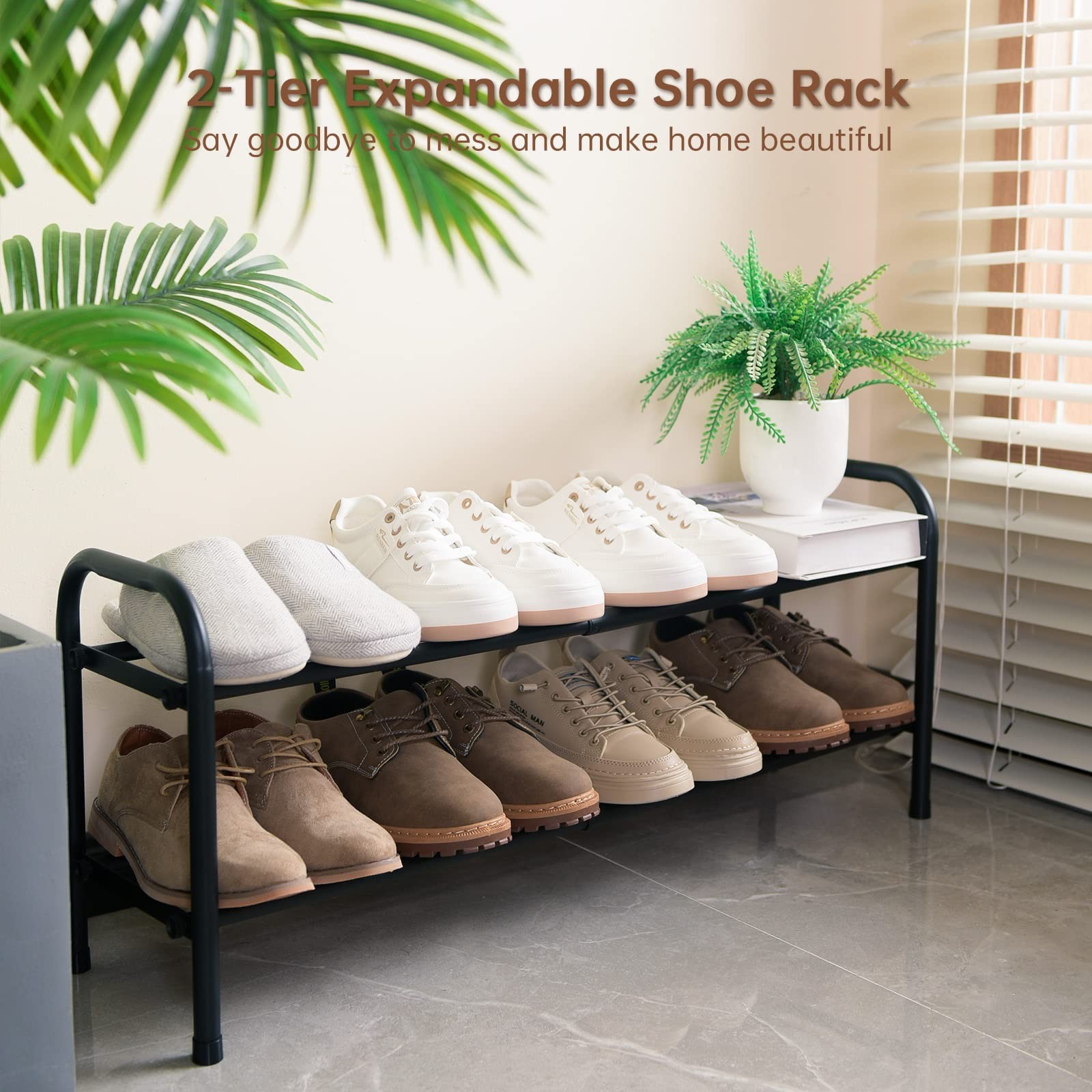 Expandable Shoe Rack:This 2 tier shoe rack can be expanded up to 33.8" and holds up to 8 pairs of adult shoes. Great Solution for shoes organization of garage,entryway,bedroom,and small place. Easy to Assemble:You will be able to assemble this shoe rack less than 5 mins without any tools.Unique and simple structure design allow you install this shoe organizer very easy but still super sturdy. Premium Quality Material:Extremely well-made of high-quality metal materials which is very druable and has smooth finish.Not only a shoe rack and adding more decoration in your home. Strong Bearing:Heavy duty thickened pipe can hold up to 13lb on Mid part,so it can hold the heavy shoes easily like leather boots,basketball shoes,etc. Multipurpose Shoe Rack:You can move the shoe rack easily with the arch handle.Adjusting the length of shoe rack according to your needs and help you save more space for your house.
