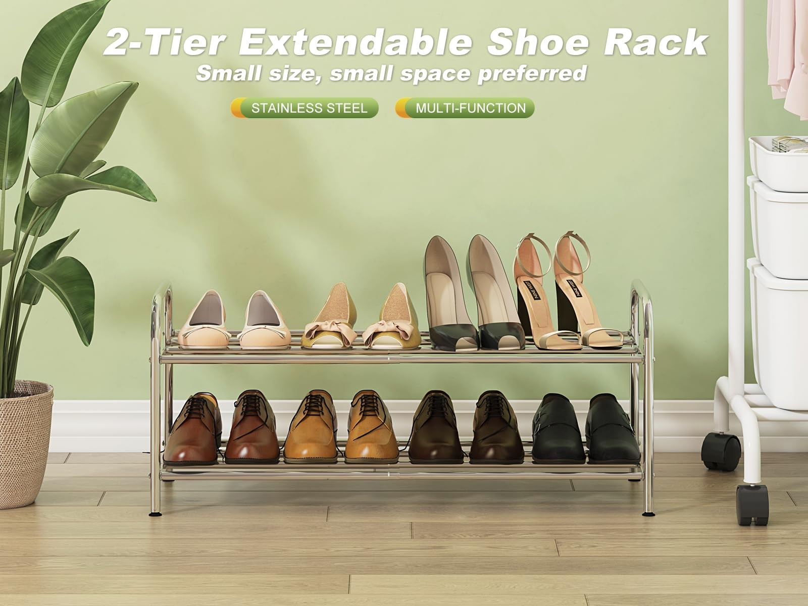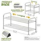 extendable shoe rack, made of stainless steel, can be adjusted in width to suit different space needs. 【Expandable Shoe Rack】stainless steel shoe rack adopts a expandable design to meet the requirements of different widths and increase storage space. 【Stretching Free Space】The shelf layer is composed of 4 stretching rods, so that it can store various items, and say goodbye to clutter. 【Sturdy Shoe Rack】Because all the poles are stretchable, it feels difficult to stretch the shoe rack. Don't worry, because we have prioritized the sturdiness of the shoe rack. 【Stainless Steel Material】Made of stainless steel, don't worry about rust, the shoe rack is more durable. Longest dimension: 27.1"W x 9.45"D x 12.6"H, shortest dimension: 15.1"W x 9.45"D x 12.6"H, weight: 4.08lbs/1.85kg. Note: Please use it in indoor spaces!