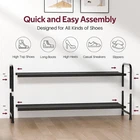 Easily Store 18 Pairs, Support Your Style: Shoe rack for closet dimension is 42.5”L x 11.4”D x 18.7”H, long shoe rack can hold up 18 pairs of shoes in total plus bottom space, such as men's sneakers, ankle boots, stylish heels, flip flops, sandals, kids shoes, etc, let's face it, most of us have more than 1 pair; Higher Tier Shelves, Fits High Boots: Each shelf height is 8",long shoe rack designed for high-heeled ankle boots or size 13 men's running shoes, each wider expandable shelf can store about 5-6 pairs men's or women's shoes; Stacking for More Space, Less Clutter: 2 sets and more can be stacked vertically to get a complete 4-tier shoe rack to hold about 30 pairs, removable shelves to fit knee high boots, stackable shoe rack help you expand floor space to store family member's shoes, shoe racks for bedroom closet declutter your floor away from messy; Say Hello to Steel Frame and Oxford Fabric: Invite a little bit of steel into your home with this sturdy closet shoe storage; showcasing the simple, clean design of powdered metal, this floor shoe rack will match greatly into any abode, and can wash the fabric with machine; Assemble in Minutes: you'll assemble the shoe holder in 5 minutes if you follow the detailed instructions in the package, the shoe rack is a solution to keep your doorway, wardrobe, dormitory, garage, living room, mudroom tidy and clean, you can also place short shoe rack at your attic, closet top shelves, basement, kitchen, pantry, etc.