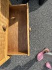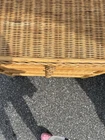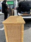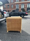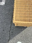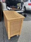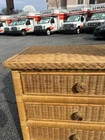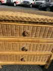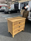 This is a vintage wicker dresser with three drawers, measuring less than 30 inches in length, 18 inches in depth, and 30 inches in height. The dresser is free-standing and has a woven design. It is an original piece from the 1990s and does not require any tools for assembly.