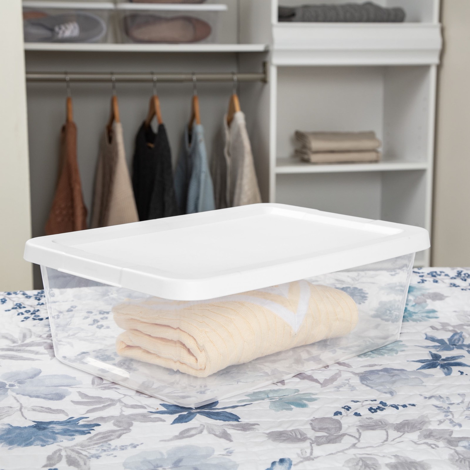 Organization is made easy with the Sterilite 12 Quart Clear Storage Bin with lid! The clear base lets you see what's inside while the snap-on lid keeps everything contained. The space-efficient shape and recessed lids allow bins to stack securely, maximizing vertical storage space. Sort and store a variety of household items to bring order to closets and bedrooms! Ideal for storing shoes, clothing, accessories, crafts and more. This size conveniently fits on standard closet shelving. Note: Use good judgment when storing items, don’t overload, keep heaviest bin at bottom, and don’t stack too high. The overall assembled dimensions of this item are 16 3/8" L x 11 1/4" W x 5 3/8" H. Sterilite 12 Quart Storage Box, Clear Plastic Storage Bin with Snap-on Lid, White Outside Dimensions: 16 3/8" x 11 1/4" x 5 3/8" Interior Dimensions at bottom: 13 7/8" x 9 1/8" x 4 3/4" Clear base allows you to view contents at a glance Snap-on lids keep contents contained and are recessed to allow for stacking Ideal for basic storage needs throughout the home, and fits on standard closet shelving Use good judgment when stacking items, keep heaviest bin at the bottom BPA-free and phthalate-free