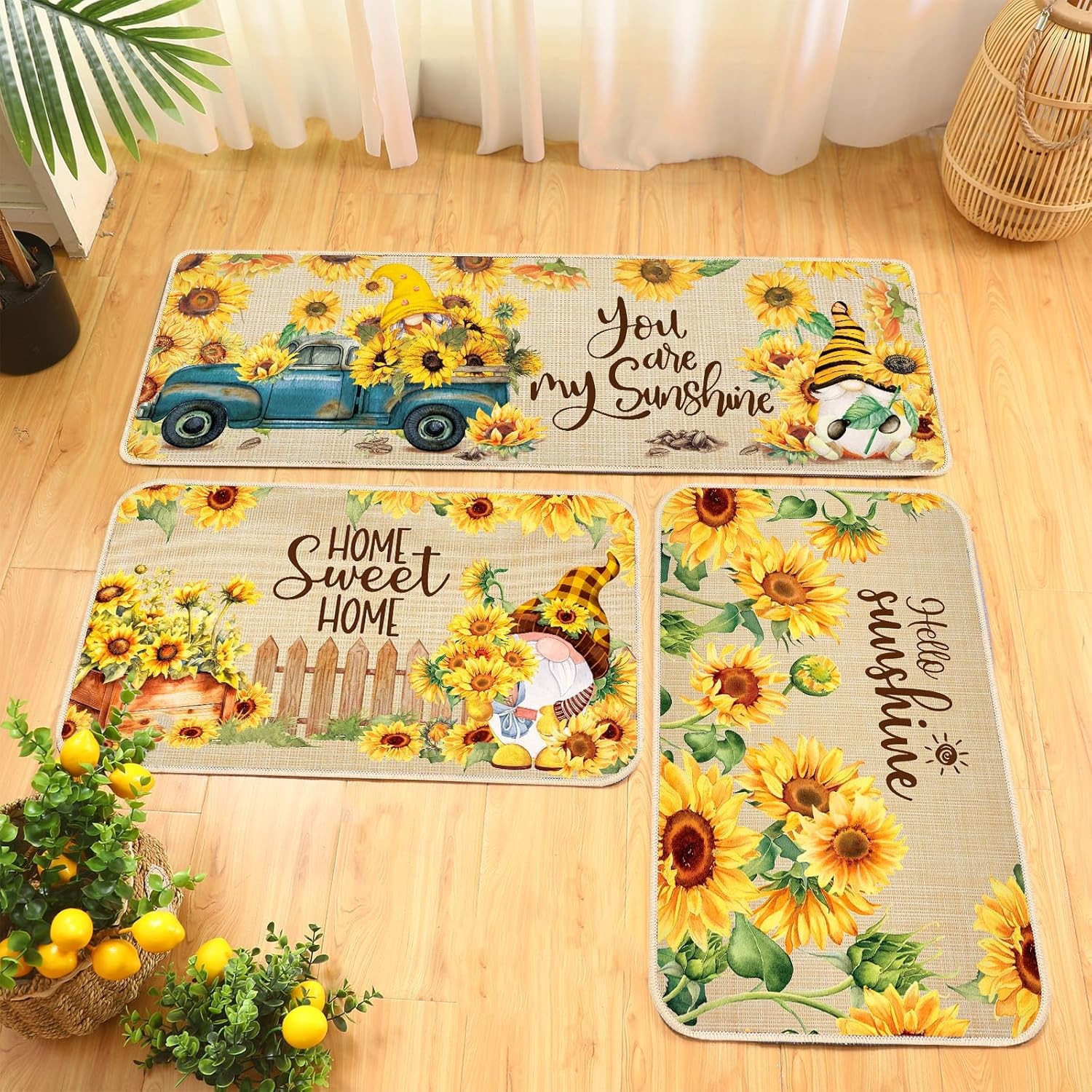 3 Pcs Sunflower Themed Kitchen Rugs Gnomes Rug Retro Non Slip Kitchen Sunflow... Ample Quantity: you will receive 3 pieces of kitchen decor rugs, available in 2 different sizes, adequate in quantity and rich in styles to satisfy your daily use and replacement demands, and you can share with others Sunflower Theme Design: the kitchen doormat adopts sunflower theme design, printed with a variety of sunflowers and related copywriting, beautifully designed, cute and delicate patterns, to create a warm atmosphere Quality and Serviceable: our summer kitchen rugs are made of quality rubber and polyester felt material, with non skid backing to avoid slip, which can reduce the chance of tripping, and is not easy to deform or fade, which can serve you for a long time Available in 2 Sizes: our kitchen floor mats are available in 2 sizes, respectively 17 x 29 inch and 17 x 47 inch, can apply to your kitchen, bathroom and office use, which can suit your different using needs Easy to Clean: these bathroom rugs are convenient to clean, you just need to spray with hose or use a sponge and cleaning products to remove dirt or other debris, convenient and saving time Shipping We offer FREE shipping on all orders! We ship within Three business days of payment, usually sooner. We use a selection of shipping services such as UPS, FedEx, USPS etc. We only ship to the lower 48 states, no APO/FPO addresses or PO Boxes allowed. Local pickups and combined shipping options are not provided at this time. Return You can return a product for up to 30 days from the date you purchased it. Any product you return must be in the same condition you received it and in the original packaging. Please keep the receipt. Customer satisfaction is very important to us. If you have any problem with your order, please contact us and we will do our best to make you satisfied. Contact Us If you have any queries, please contact us via ebay. We usually respond within 24 hours on weekdays. Please visit our eBay store to check out other items for sale! Thank you for shopping at our store.