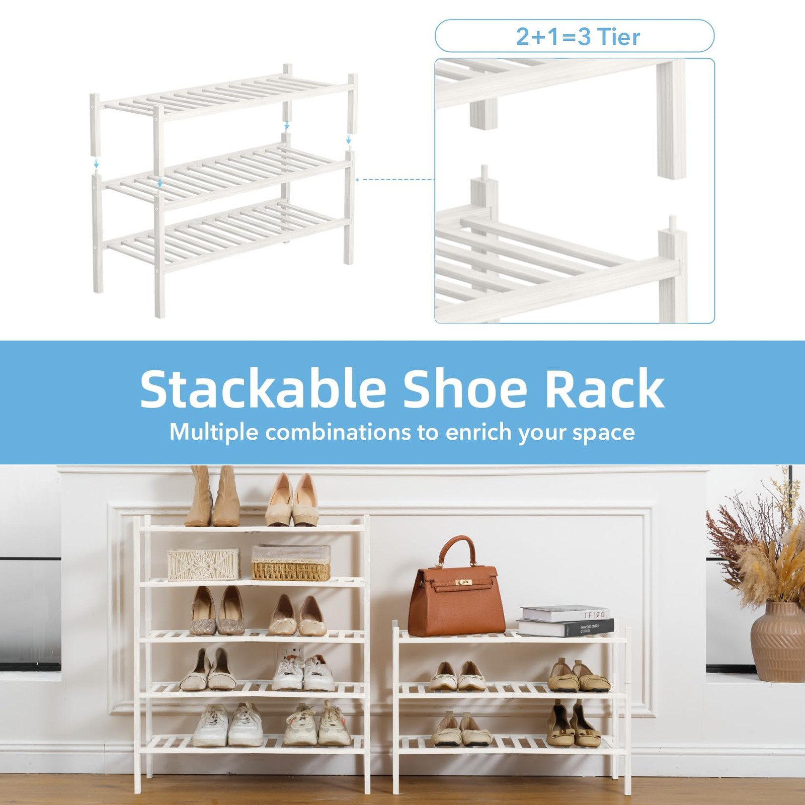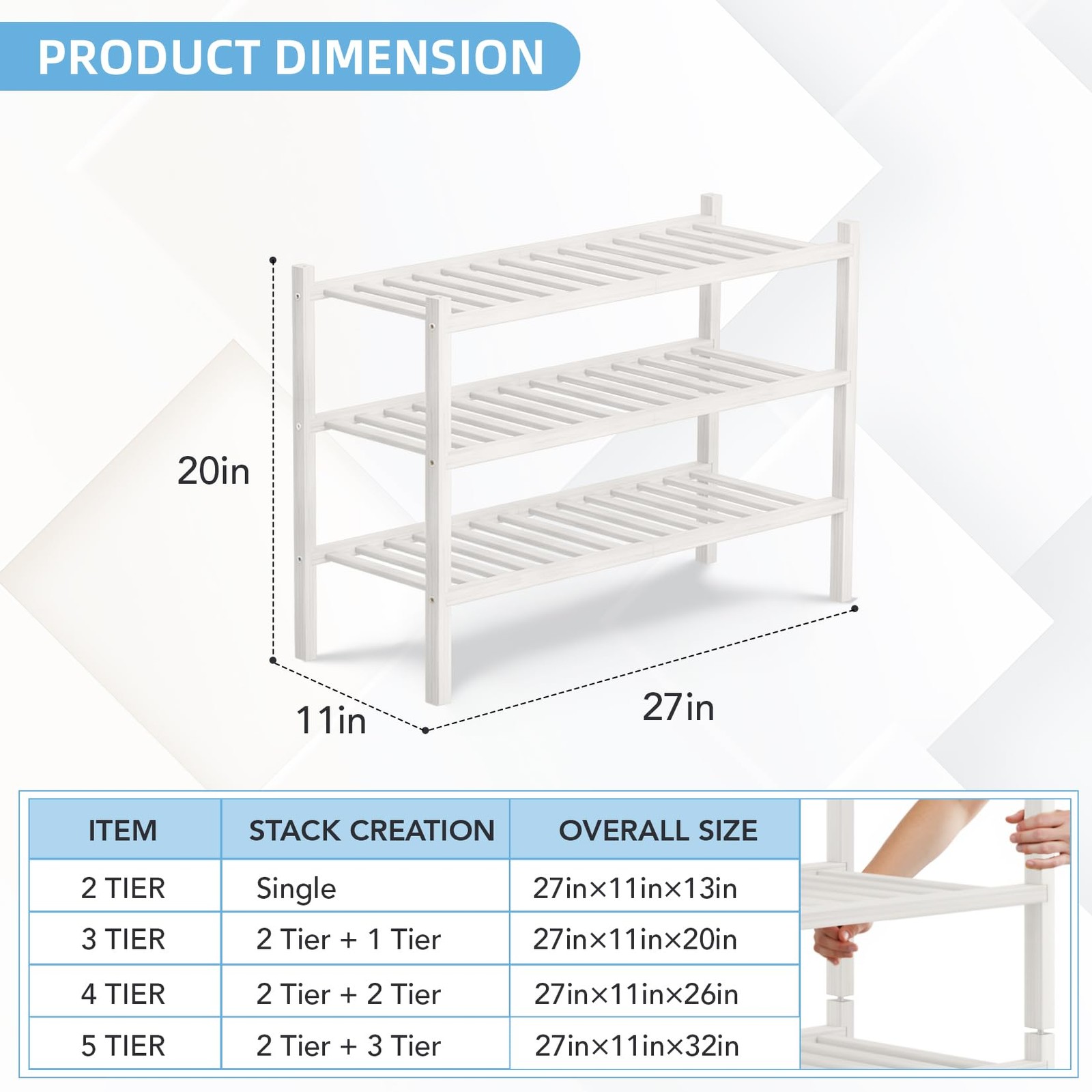 3 Tier Bamboo Shoe Rack Storage Organizer for Closet, Multifunctional Stackable Free Standing Shoe Shelf Organizer for Small Space,Entryway, Hallway, Bathroom27"x11"x20" (White, 3 Tier) Stackable Design: Each type of shoe rack is stackable, and you can design the height you want according to the needs of your living space. For example, two 2-tier shoe rack units can be stacked into a 4-tier shoe rack, or two 3-tier shoe rack units can be stacked into a 6-tier shoe rack. We have 2 colors and 4 heights for you to choose from, creating your unique living space Large Capacity Space: This stackable shoe rack utilizes space through adjustable layers, making a small space three-dimensional and allowing you to store many things. Each tier is about 6.35" high,enough to store what you want. Each tier can hold three pairs of shoes without crowding, and reasonable space utilization makes your home more tidy and orderly Natural Materials: Natural bamboo growth fills the home with a natural atmosphere. Using naturally grown bamboo as the material, it is finely cut and subjected to high-temperature carbonization treatment to become sturdy and durable. The careful polishing process and fine coating technology make the surface of the bamboo shelf smooth, without harming your skin and clothing Multi Functional Storage: This shoe organizer keeps your shoes organized, with 4 heights to choose from, suitable for most home environments. In addition, this shoe rack has multiple uses, and its simple and elegant design can help you organize daily necessities such as toiletries, towels, books, small plants, etc. in the bathroom, living room, office, and kitchen. It maximizes space utilization, simplifies structure, and helps you maintain a clean home No Additional Tools Required: The foldable shoe rack comes with illustrations and is easy to install. The package contains all the necessary tools, and with the accompanying screws and hex wrench, assembly can be easily completed. The shoe rack adopts a mortise and tenon structure and groove connection, which is very sturdy and durable. In less than ten minutes, you can complete the installation and get a practical shoe rack After-sales Service: The easy to assemble structure makes the bamboo shelf easy to maintain, and it only takes up space in a small box when stored. If you have any questions, please feel free to leave us a message. Our after-sales customer support team will reply to you within 24 hours