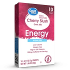 About this item Product details Each box of Great Value Cherry Slush Energy contains 10 Singles To Go and is a naturally and artificially flavored, low calorie drink mix containing zero sugar, and is gluten free and Kosher. High in 5 B Vitamins. Contains 120mg Caffeine Per Serving. Contains 120mg Caffeine Per Serving. Zero Sugar, Low Calorie, Kosher and Gluten Free Drink Mix. Each serving is high in five B Vitamins. Easy to Make SIP from a full bottle of water to make room for powder