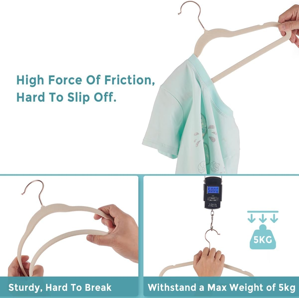 【Closet Organization】- This baby hanger set contains 30 pack velvet kids hangers + 10pcs matching finger clips (can be used alone or used with slim-line hanger to clip skirts, pants, blankets and socks), increasing your buying value and giving your child’s closet an instant makeover. 【Sturdy Premium Quality】- Made of 80% ABS plastic and 20% anti-slip satiny velvet flocking, these kids clothes hangers are sturdy and long lasting enough for repeated daily use, holding up to 10lbs of weight per hanger. 【Humanized Design】- Soft velvet flocking provides a non-slip surface that holds fabrics in place, precisely-cut shoulder notches secure strappy tanks and dresses. Shiny chrome hook with 360-degree swivel allows all clothes hung in the same direction for a neat appearance in seconds. 【Slim Space Saver】- Ultra Thin children velvet hangers optimizes closet space. Ideal size for each kid hanger: 11"W x 6.9"H x 1/4" thickness, increasing closet space by up to 50%. 【Satisfying Your Needs】Hang everything including puffy winter coats, school uniforms & summer dresses with these non-slip, space-saving velvet kids hangers. 11-inch and 14-inch are the right sizes for maximizing closet space. Reassuring purchase with 100% satisfaction service and 90 days return policy. Product Description Organize Your Kids' Wardrobe with Velvet Hangers! Discover the perfect harmony of organization and style with these velvet hangers from Tonswachic. Measuring at 11 inches and 13.8 inches for options, these hangers are not only sleek but also ideal for keeping your baby kids clothes in impeccable order. The soft felt ensures a gentle touch on delicate fabrics, while the sturdy design keeps everything in place. Choosing the right size of Kids Velvet Hangers Start by considering your child's age and the size of their clothing. For infants and toddlers, 11-inch baby hangers, like the Newborn Velvet Hangers, are generally the most suitable. As your child grows, you can transition to larger 14-inch hangers to accommodate their expanding wardrobe. The anti-rust hooks rotates 360 degrees making browsing, taking, and hanging clothes easier by using this children's hanger. The contoured shoulders, cut notches, and non-slip velvet coating will ensure all your children's clothing is kept securely in place and wrinkle free. The ultra thin design of the child hangers maximizes storage space and fully utilizes your baby closet, increasing up to 50% space. Extra 10 pcs velvet hanger clips for keeping baby and kids' clothes neatly hung and organized. Invest in these non-slip toddler hangers and say goodbye to messy closets and wrinkled garments. Kids Velvet Hangers are the perfect solution to keep your child's clothes organized, wrinkle-free, and in optimal condition. Non-slip Baby Hangers Velvet Unlike regular hangers, velvet hangers prevent clothes from slipping off, keeping them in place and wrinkle-free. The soft felt ensures a gentle touch on delicate fabrics, while the sturdy design keeps everything in place. Soft Durable Kids Hangers Kids Velvet Hangers offer a combination of non-slip grip, gentle support, and space-saving design. They are specifically designed to meet the needs of children's clothing, making them the ideal choice for parents looking to keep their child's wardrobe organized and in top condition. Space Saving Hangers for Children's Wardrobe The slim design of these hangers is another standout feature. The sleek profile allows you to maximize closet space, fitting more clothes in without any hassle. This is particularly beneficial if you have a small closet or multiple children sharing a wardrobe. Perfect Closet Organizing Solution Kids Velvet Hangers have been a game-changer for our children's closet. With their non-slip grip, gentle support, and space-saving design, these hangers offer a range of benefits that make dressing your children a breeze. A well-organized closet not only saves you time and effort but also teaches your child important organizational skills from a young age. So why wait? Get the new Kids Hangers today and enjoy the benefits of a clutter-free and stylish closet for your little ones.