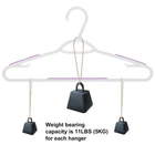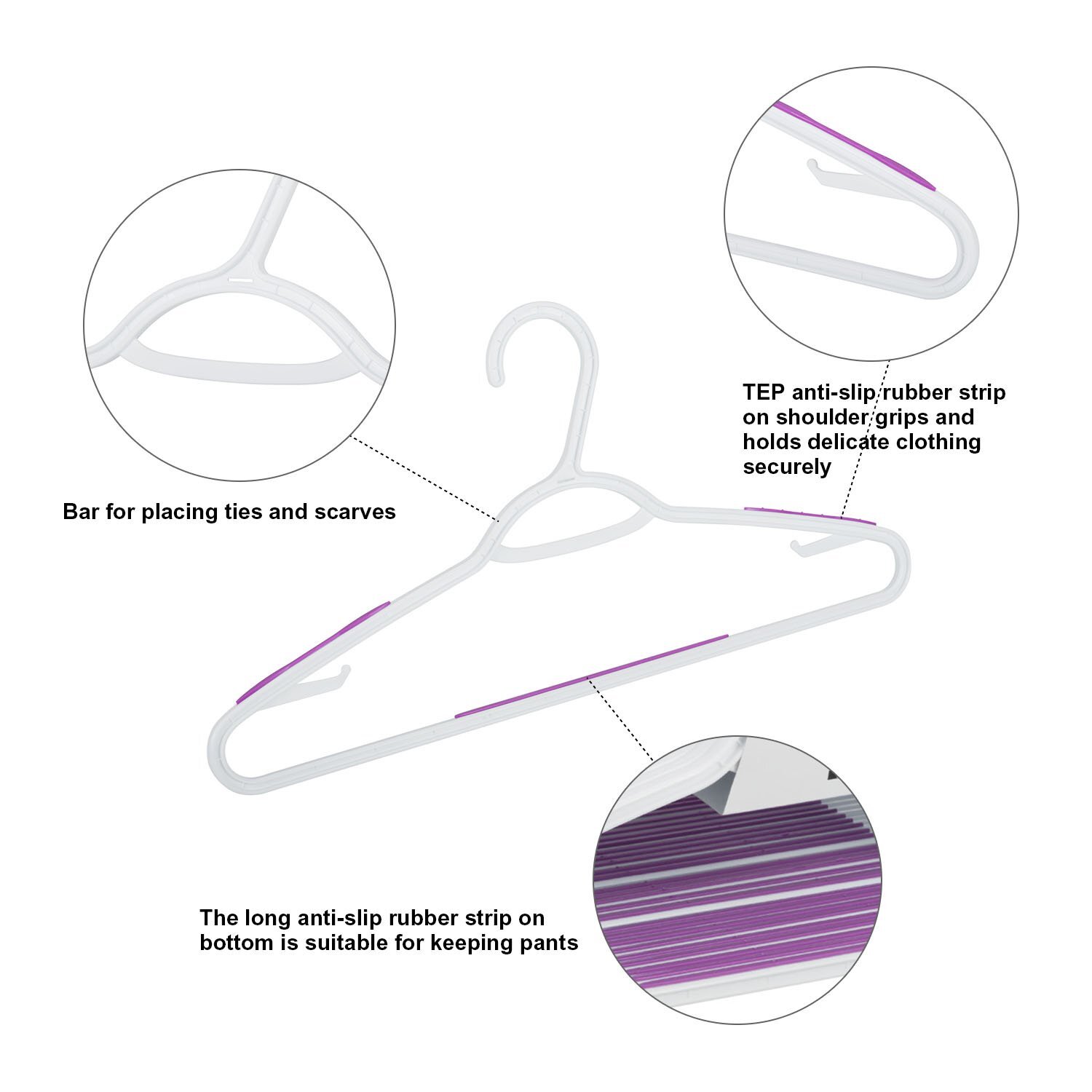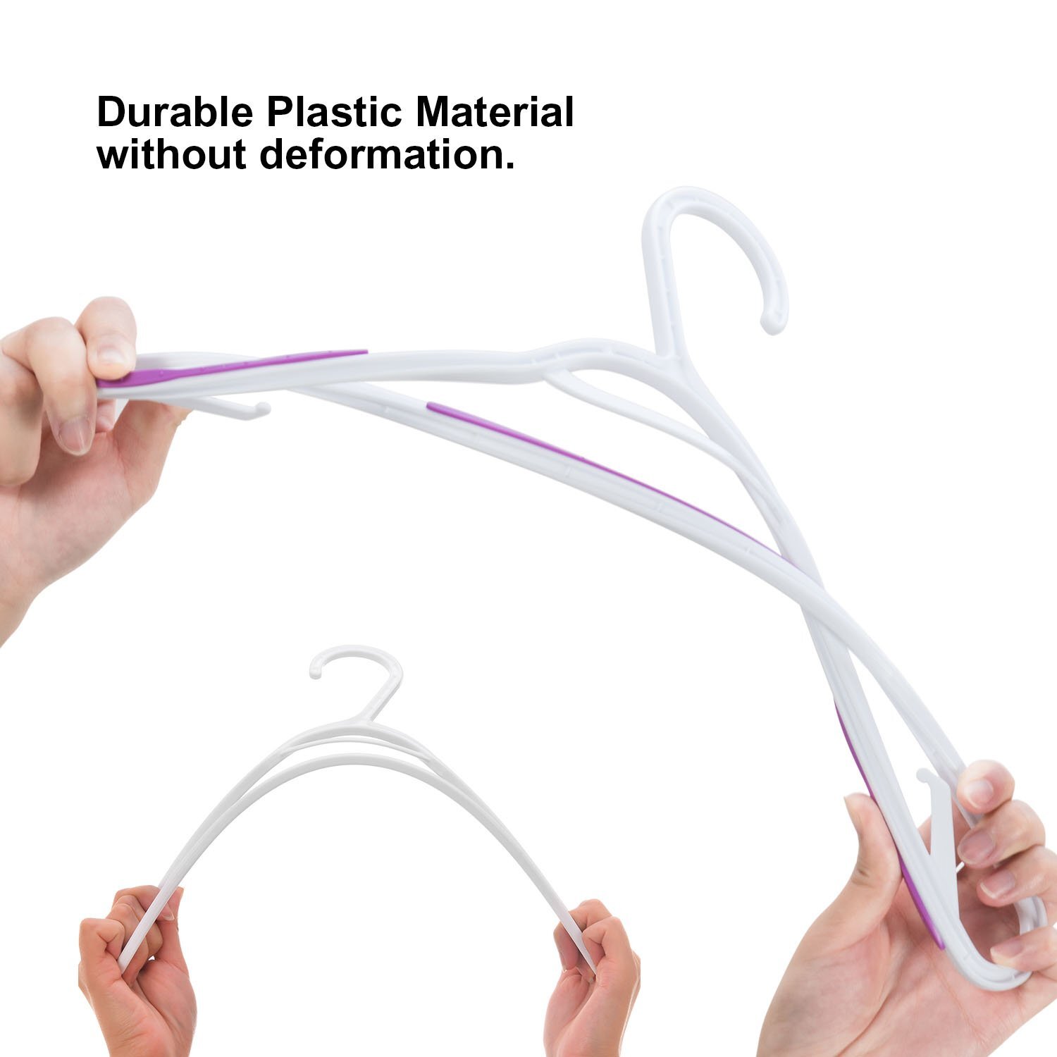 Dimensions: 16.3" x 8.4"x 0.3". Slim profile design maximizes closet space Strong and Durable: Made of strong and durable plastic that will last for many years. Each plastic hanger is built to withstand heavy clothing of 11 lbs Stylish and Functional: With the integrated clips you can hang skirts, pants, pants and many more with ease Design: Non-slip technology on the shoulders and pant bar, which grips and holds delicate clothing securely Wet and Dry: The Hangers will work perfectly for all types of wet and dry fabrics and can also handle spaghetti straps, silk and chiffon