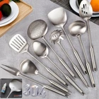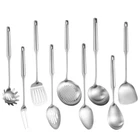 High Quality All Metal Cooking Utensils Set: Made of food-grade heavy duty 304 stainless steel, forged in 1-piece, sturdy and anti-rust. Very clean lines, good weight and balance, comfortable grip, ergonomic design. Great Choice for Presents: 1 wok spatula, 1 ladle, 1 skimmer, 1 slotted spatula, 1 spaghetti spoon, 1 large spoon, 1 meat fork, 1 serve spoon, 1 serve slotted spoon. Plenty of tools for all needs, easily meet challenges of any menu or dish, great presents for a cooking enthusiast. Easy To Use and Store: The handles are round but hollow, so they're not so heavy, helps to eliminate stress on the arms, the handles are temp proof so they won't burn your hand. With big hanging holes, easy to be hung to save space. Easy To Clean: Forged in 1-piece, prevents dirt and grime from hiding, easier to clean. Hand wash or dishwasher safe. Compared to silicone or wood material, healthier and more sturdy, also wouldn't affect the taste of food. Professional Kitchen Utensils Set Stainless Steel: A complete complement to carbon steel, cast iron woks, great for home use and commercial use, restaurant, hotel, picnic etc.