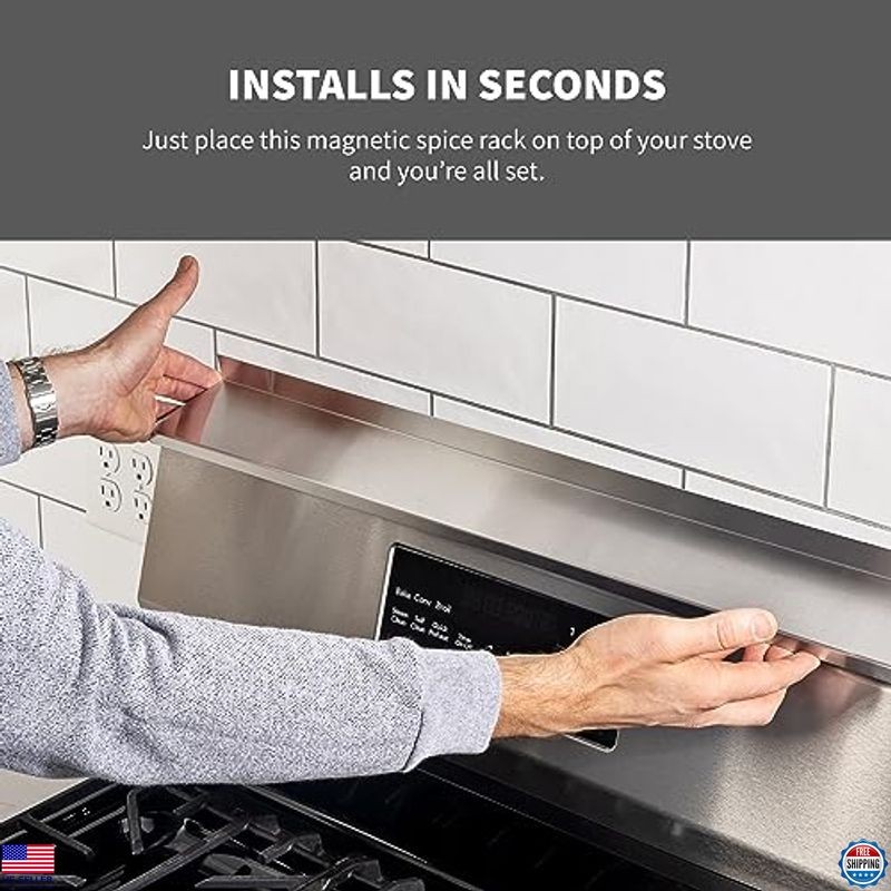 StoveShelf 30" Length Black Magnetic Shelf for Kitchen Stove - Kitchen Storage Solution with Zero Installation - Over Stove Spice Rack Organizer Description Elevate your experience with our Fan Favorites product, designed for effortless setup and enjoyment. Watch our engaging video for a step-by-step guide and product comparison, ensuring you get the most out of your purchase. Don’t miss out on the ultimate accessory that combines functionality with fun! Product reference: B071DRC9HY. Features THE ORIGINAL STOVE SHELF: Maximize your kitchen storage while giving your stove a sleek, updated look! StoveShelf is a durable, magnetic shelf that quickly attaches to your stove, providing a sturdy storage space for condiments, spices, oils, and decor. ZERO INSTALLATION NEEDED: Installation? There isn't any! No need to purchase special adhesives or drill holes in your kitchen wall. Just place this magnetic shelf on top of your stove and you're all set POWERFULLY SECURED BY MAGNETS: StoveShelf is fitted with two silicone encased neodymium magnets that keep it securely attached while protecting your stove's factory finish. To ensure compatibility prior to purchase, please use any household magnet and place it along the top panel of your stove to check for magnetism DESIGNED TO LAST: Built in the USA from premium materials, StoveShelf was designed for a lifetime of use and the stainless steel body will withstand rust, odors, stains, and corrosion. This is a one time purchase you'll be thrilled you made every time you step foot in your kitchen FITS MOST FLAT AND CURVED STOVES: Measuring 30" x 3.5" x 1.5", StoveShelf is designed to fit both flat and slightly curved stoves. The magnets can also be repositioned for a custom fit! Stove Compatibility Chart available in our product carousel images. Prior to purchase, we recommend testing the back panel of your stove with any household magnet to ensure it is magnetic Shipping Free & Fast Shipping: We offer free shipping to most of the USA with a normal delivery time of 3-7 days. However, due to the current situation, additional delivery time (up to 3 weeks) may be required for some items. Alternative Carriers: We may use alternative carriers (e.g., USPS, FedEx, UPS) to ensure your package arrives safely and on time. Due to the use of multiple carriers, we are unable to provide a tracking number automatically. Handling Time: Orders are processed and shipped within 1-2 business days of receiving cleared payment. Shipping Restrictions: Shipping to Alaska, Hawaii, Puerto Rico, Guam, and other US territories may incur shipping charges or delivery restrictions. Please contact us before ordering, or your order can be refunded/cancelled. State Restrictions: Certain items may not be shipped to California due to state regulations. Contact for Tracking Updates: If you require tracking updates or have any concerns about the delivery of your order, please feel free to contact us, and we will be happy to assist you. Return Policy 30-Day Hassle-Free Returns: If you are not completely satisfied with your purchase, you can return the item for free within 30 days of receiving it for a full refund or exchange. Easy Return Process: Contact us, and we will provide you with a prepaid return shipping label and detailed instructions. No Restocking Fee: There are no restocking fees for returns. However, the buyer is responsible for return shipping costs if the return is not due to a seller's error. Refund Processing: Refunds will be processed within 1 business day of receiving the returned item in its original condition. Payment ...