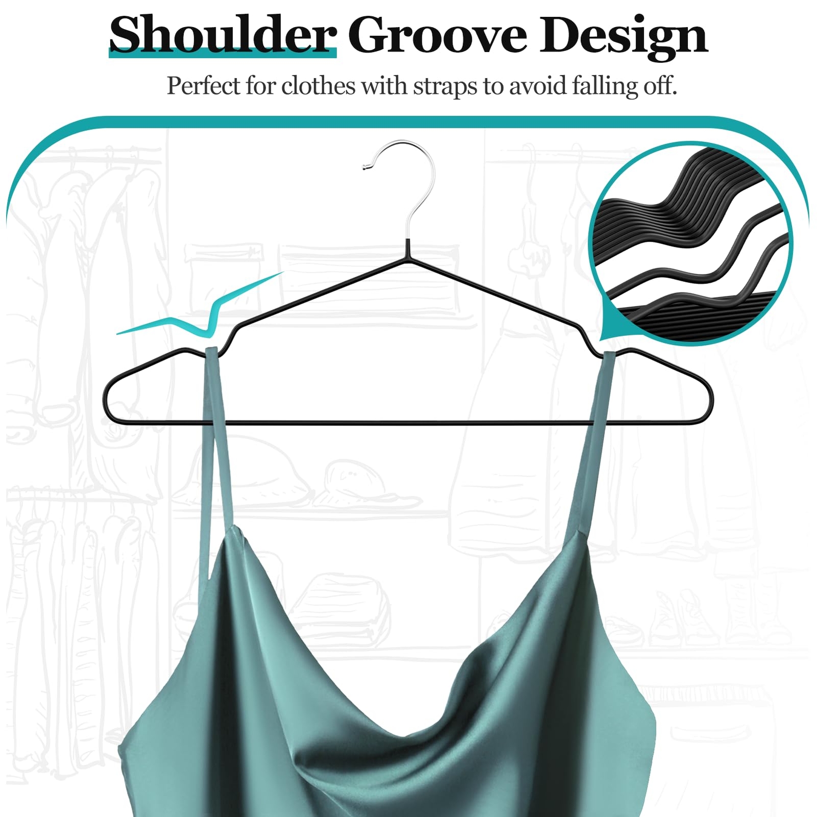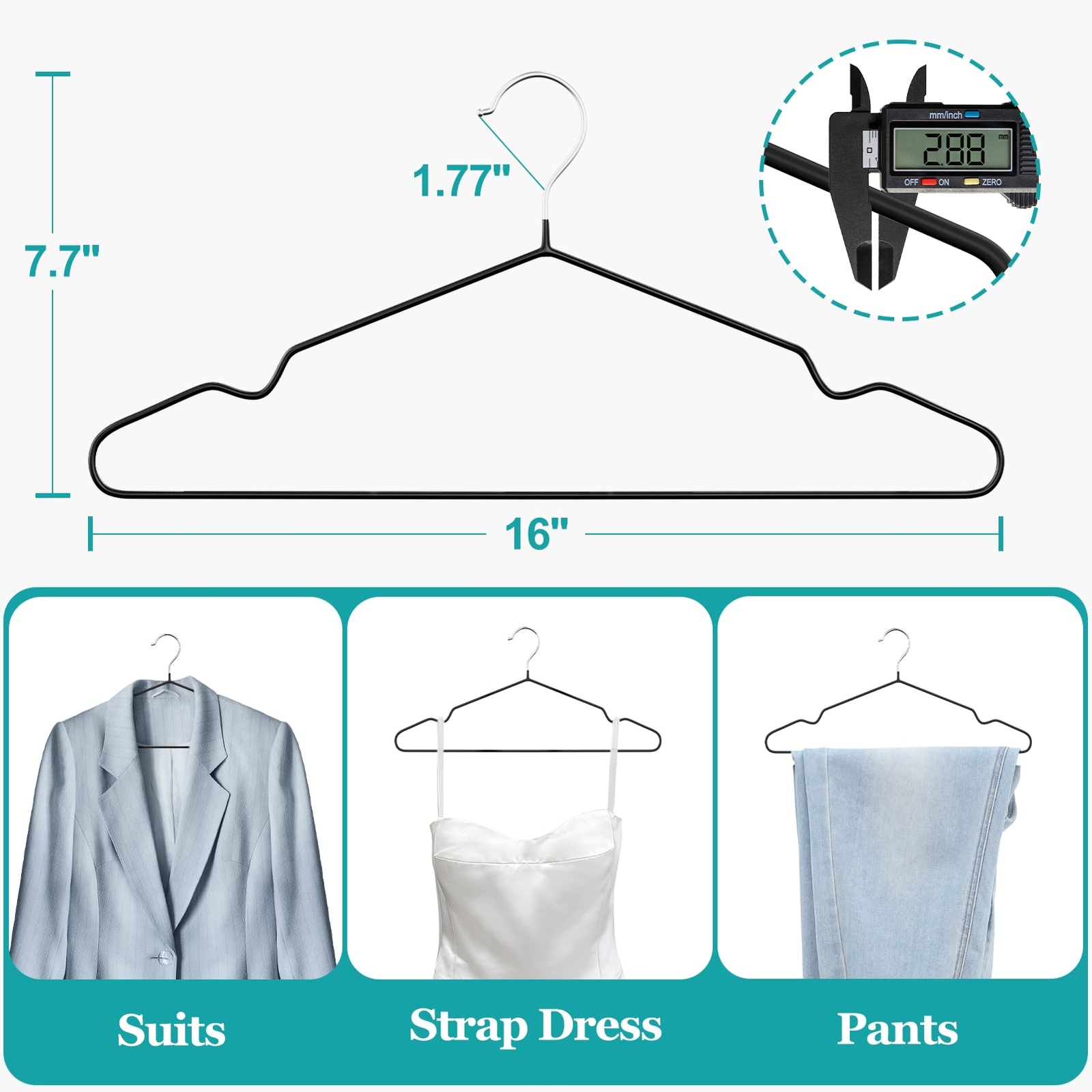 Durable and Anti-Rust: Value pack of 30 pieces! Each hanger size: 16 “Wx7.7 “Hx0.11“T.Thickness gauge is 2.8mm.This ultra-thin heavy duty metal hangers are made of high quality alloy material,sturdy and durable structure won't deformed,rust-free for indoor or outdoor use,can easily hold all kinds of clothes,even heavy coats Upgraded Non-Slip Material:Special upgraded super non-slip rubber coating with matte black,feel more comfortable and non-stick,can prevents clothes from falling off Shoulder Groove Design:Notched shoulders to prevent clothes from falling off,suitable for hanging clothing with straps,such as strap dress,camisole,and underwear No Bump Design:metal hangers shoulders are designed to mimic the natural curvature of the human shoulder,preventing your clothes from forming shoulder indentations and making your clothes look more natural Space Saving:Slim design maximizes your closet space,solve this trouble of your messy clothes taking up the whole wardrobe,keep your clothes neat and organized.Non-slip hangers are suitable for suits,coats,sweaters,camisole, jackets,pants and more