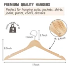 Safe & Smellless Coating Wooden Hangers: Covered with eco-friendly paint without any unpleasant odor. These wood coat hangers are safe for our family and pets. Not Easy Broken Off: Made of solid wood, can hold up to 11 lbs. These wood hangers are strong enough to hold your winter coats. They are not flimsy when hanging your heavy duty clothes. Hand Polished Smooth Surface & Ergonomic Shoulder Design: With double hand-sanding craft without burr, the surface of wooden clothes hangers becomes smooth and protect your clothes from snagging. A contoured shoulder line on the coat hangers for closet, helps your clothes stay in original shape, keeping shoulder no bulges. Perfect Notches Shape & 360 Degree Swivel Hook: Notches on both side shoulders of wooden coat hangers can be used to hang your tank tops, dresses, bras etc. What's more, you can hang or take clothes at any angle in the closet with 360-degree swivel chrome anti-rust hook design. Space Saving Clothes Hangers: 0.4" thickness Slim wooden hangers for clothes with a strong pant bar allows it to hang a coat and a pant in the same time, it is not only looks elegant but also helps to maximize your closet space. Dimensions 17" x 8.3" x 0.4" wood suit hangers, packed in a hard box to prevent breaking during delivery!