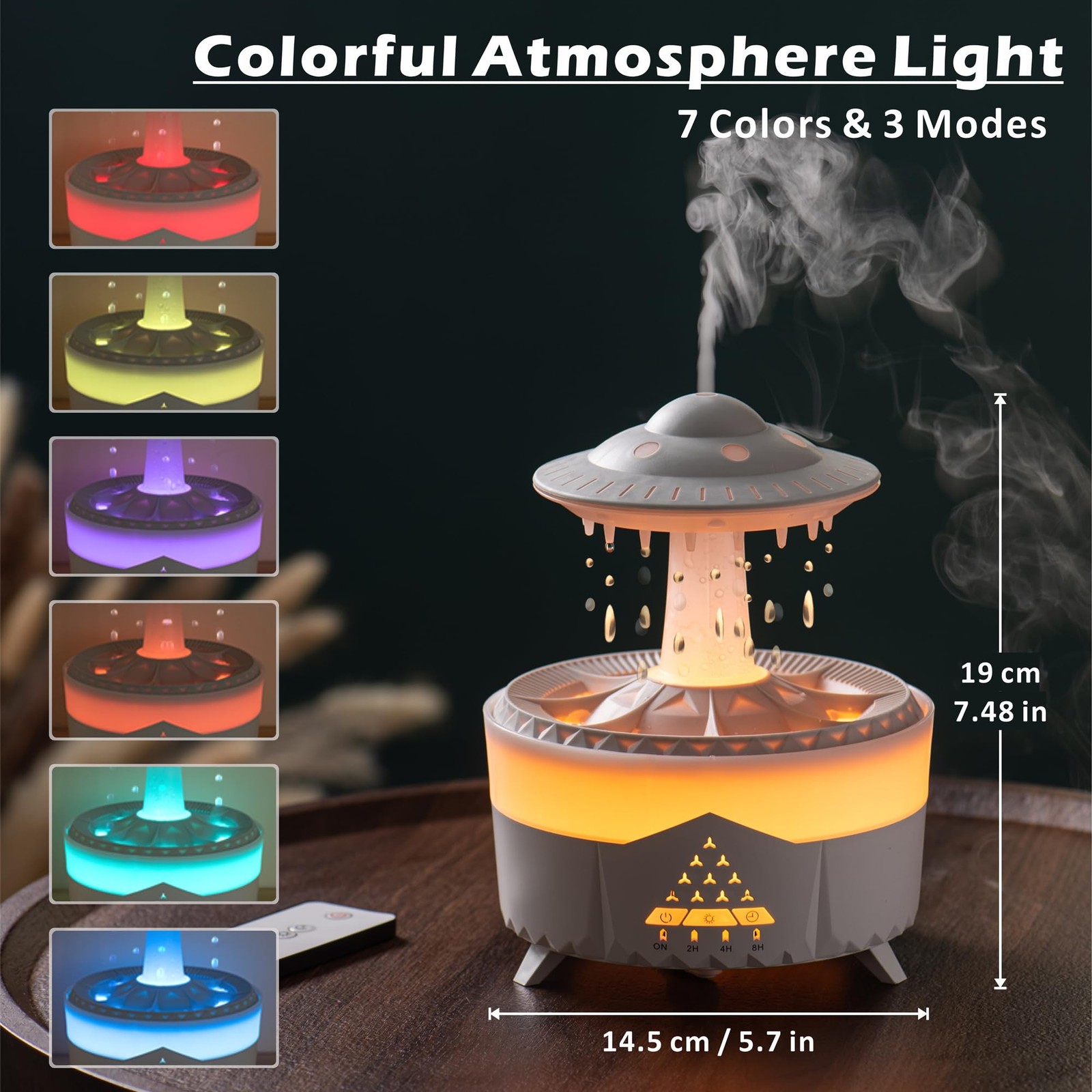 Essential Oil Diffuser 350ML UFO Raindrop Aromatherapy Diffuser Cool Mist Humidifier with 7 Colors LED Lights,Remote Control,Plug in for Bedroom,Office (White) UFO Raindrop Design Air Diffuser - Unique UFO flying saucer and Spring raindrops design, it’s not only an humidifier aromatherapy diffuser, but also a aesthetic home decoration artwork to release your stress. 7 Lighting Colors & 3 Modes - This aromatherapy diffuser features 7 Lighting Colors and 3 Lighting Modes. You can choose one color lighting or set a flash mode, which is a great choice for meditation, relaxation, yoga. Also you can use the humidifiers for bedroom as a night light. Remote Control & Timing - The electric scent diffuser comes with a remote control and features 2H/4H/8H timer settings, which will be convenient for you to operate and create a personalized aromatherapy experience for you. 350ML Water Capacity & Auto-Off - Our aromatherapy diffuser has a 350ml water tank with 10-30ml/h spray volume, can last more than 10h. The automatic power off function for water shortage ensures safe use and no worry about whole night using. What You Will Get - DC Adapter (ETC/FCC Certified), user manual, 350ml aromatherapy diffuser humidifier, and our 100% satisfied service! Patent number: USD1017012S