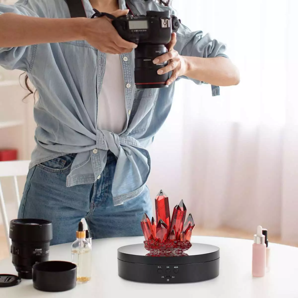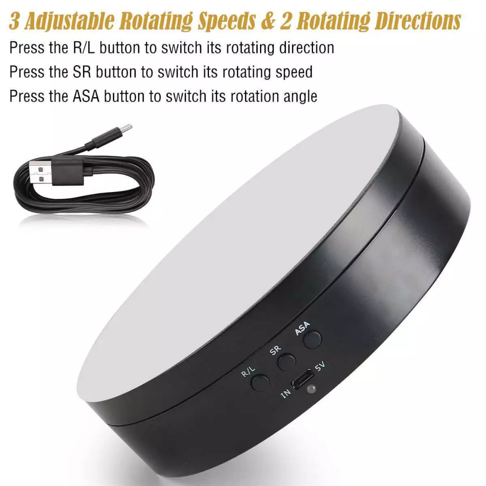 To our esteemed customers Hello! If you buy the package in our store any after-sales problems please do not worry, we will certainly solve the problem for you, please feel free to contact us by mail, we will communicate with you within 24 hours to confirm the program you provide, 100% satisfaction to solve your problem! Thank you for every purchase in our store, wish you a happy ~! 360° Electric Motorized Rotating Display Stand Jewelry Photography Show Holder 💎【Turntable Rotating Display Stand】-- A rotating display stand for professional photographers with excellent design to make product photos and video shooting more perfect. Max load 6.6lb, Package including rotating display stand USB cable (batteries not included). 💎【Wide Use】-- The motorized rotating display stand perfect for display watch, digital product, shampoo, glass, bag , Jewelry and Collectibles. Turntable perfectly handles a wide range of usage needs. 💎【Flexible Adjustment】-- Rotating display stand 3 gears manual speed adjustment, 10/15/30 seconds /lap, and 4 angles display--45°, 90°, 180°, 360°, you can adjust speed and angle to various demands. 💎【Turntable Size】-- Turntable diameter 5.4in / 13.71cm * height 1.4in / 3.5cm, lightweight 0.3kg. 💎【Quiet and Smooth】-- Rotating display stand motorized runs quietly and won't affect your video shooting.Which is nice should you ever decide to use turntable to display a product at an event. 💎【Small But Powerful】-- Motorized rotating display stand black 5.4inch, This turntable small in size but with a maximum load capacity of 6.6LB. 💎【Easy To Use】-- Rotating display stand Easy to operate one button start, switching ON/OFF Button; turntable handy and Easy to Operate stably and safely. Specifications: Color:Black Material: ABS Speed: 3 Rotational Speed Loading Capacity: 3kg Display Angle: 45°/90°/180°/360° Power Supply: 5V USB Port Power OFF: Long press any keys for 3 seconds Power Supply Mode: USB Power / Storage Power / External Battery 1865 Lithium Battery or 3 AAA Battery (not included) Diameter: 5.4"" / 13.7cm Height: 1.4"" / 3.5cm 0~6.6 Pounds Loading Weight Clockwise and anti-clockwise (Press R/L can change the rotate direction) Features 360 Degree Steady Rotation: Our turntable drives the top rotation in omnidirectional to catch most eyesight on a table, counter, shelf, rack, shopwindow. 1.6RPM, Available rotation in clockwise direction or CCW direction, just press the button to change rotation direction. Use very convenience, functions multiple. Flexible Adjustment: Our rotating display stand third gear manual speed adjustment, 10/15/30 seconds / lap, and 4 angles display--45°, 90°, 180°, 360°, you can adjust according to various demands, just press the switcher. So easy to get your expecting effect. Small But Powerful: Up to 6.6 pounds centric loading capacity, excellent structure lets it rotate very steadily, Small in size but with a maximum load capacity of 6.6LB. Quiet and Smooth: This rotating display stand motorized runs quietly and won't affect your video shooting. Modern design, easy to use, multi-function, excellent effect, durable in use, ideal for product display in exhibition or shop. Product Operation Instructions: Turn ON or OFF: Press and hold the SR key for 3 seconds to turn it on or off. Clockwise and anti clockwise: Press R/L can change the rotate The third speed regulation is 2-4-6 revolutions per minute respectively, the maximum load-bearing capacity is 4 kg-3 kg-2 kg according to different rotating speeds. Forward and reverse rotation function: Set the round-trip rotation function according to the rotation angle. The round-trip rotation angles can be set to 45-90-180-360 degrees respectively. There are four power supply modes to choose from: USB direct insertion AC power supply, USB charging treasure power supply, three ordinary 7th batteries power supply, rechargeable lithium battery power supply. Package includes: 1 x 360° Electric Motorized Rotating Display Stand Jewelry Photography Show Holder (Select Color From Menu)"