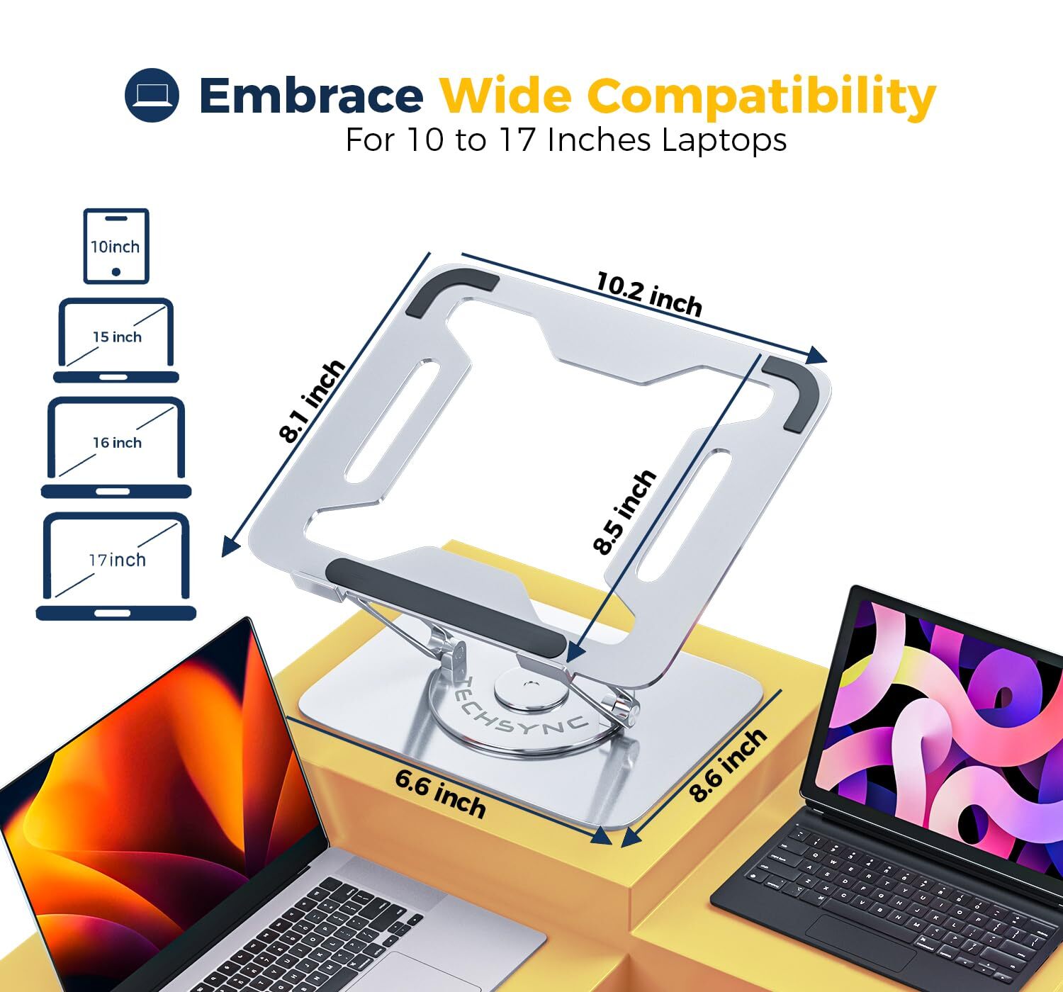 Robust Stability for Peace of Mind: Feel confident and focused while you work with laptop stand's sturdy build, ensuring a rock-solid foundation for your laptop stand. No more wobbling or uncertainty, just a stable, reliable support for your productivity. Ergonomic and Sleek Design: Say goodbye to neck and back pain as our adjustable laptop stand for desk raises your screen to an optimal eye level, promoting a healthy posture and reducing strain. Easily customize height and angles (0-90 degrees) for a personalized and efficient workflow. Elevate your productivity and well-being today! Instant Setup for Immediate Success: Eliminate the hassle and frustration of assembly. Our foldable laptop stand comes preassembled, saving you time and energy, so you can dive straight into your tasks with ease and efficiency. Elevate your work style! 360 Degree Rotation: Enhance your conferencing and teaching experience with our swivel laptop stand! Its 360° rotating base offers flexibility for seamless screen sharing, fostering better connections in meetings and classes. Ideal for video conferences, providing a professional edge while making a personal connection. Portable Powerhouse for Your Ambitions: Unleash your potential without constraints. Our portable and collapsible laptop stand for desk doesn't limit to space or location, giving you the freedom to create, work, or connect whenever and wherever inspiration strikes. Embrace the liberating feeling of lightweight portability.