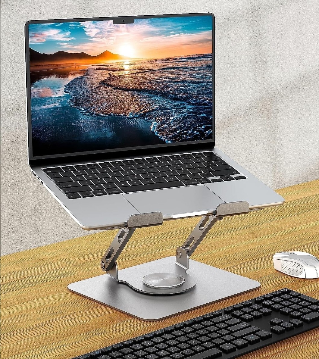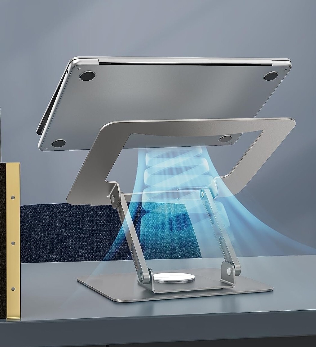 Product Features Collaborate with Ease : The laptop stand features a 360° rotatable base, making it easy to share your computer screen with others while collaborating on projects. Heavy and Stable : Made of high-quality metal material, the laptop stand base is heavier than normal laptop risers made of lightweight aluminum alloy; and upgraded joint screws keep the laptop stand stable at the desired height and angle, providing less wobbling and more stability. More Ventilation : The ventilated laptop stand has a hollow design that provides more space for heat to escape, preventing your notebook computer from overheating. Adjustable Height & Foldable Design : The adjustable height and multi-angle make it more ergonomic, while the eye-level height of your laptop prevents neck pain. The stand can be easily folded up and stored, keeping your office desktop clean. Compatible with Various Laptops : The stand is compatible with any laptop computer between 10-15.6 inches, including Mac, MacBook Air, MacBook Pro, Microsoft Surface, HP, Google PixelBook, Dell XPS, ASUS, Lenovo, Acer, Chromebook, etc. It is a great laptop accessory for working from home or the office and attending Zoom calls.