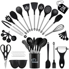 【38-Piece Silicone Kitchen Utensils Include】Hanging Hook x 10, Measuring Spoon x 5, Measuring Cup x 5, different sizes of Spatula x 3, Oven Mitt x 2, Solid Spatula x 1, Slotted Spatula x 1, Solid Spoon x 1, Slotted Spoon x 1, Soup Ladle x 1, Handled Strainer x 1, Spaghetti Spoon x 1, Brush x 1, Kitchen Tongs x 1, Egg Whisk x 1, Kitchen Scissors x 1, Peeler x 1, Utensils Holder x 1. A single purchase will put together whatever kitchen gadgets you need without the need for multiple purchases 【High Quality Food Grade Silicone】Our kitchen utensils set is made of healthy and non-toxic silicone, so there will be no odor and no chemical reaction with any food and drink when cooking. Using it will not cause any health burden. It is recommended to soak the cooking utensils set for 30 minutes when using for the first time, and then dry them well to eliminate the initial odor 【High Temperature Resistance】 our silicone spatula can withstand high temperatures up to 180°C and does not melt or deform easily. Compared to other materials, our kitchen set has a longer service life. The flexible material also reduces noise and does not scratch the bottom of the pan 【No Stain Hiding Design】 High quality stainless steel handle of our kitchen utensils set with holder is healthy and durable, rust-proof and corrosion-resistant. The craftsmanship is exquisite with no gaps, easy to clean. If you think it's a hassle, you can put our kitchenware in the dishwasher to clean it and free up your hands 【Kitchen Essenti】Our cooking utensils have both spoon set and spatula set, as well as kitchen shears, peeler and other kitchen tools, which can fully meet your cooking and baking needs. The handle is designed with thoughtful hooks for easy storage and drying. In addition, the silicone utensil set also comes 10 hanging hooks and 1 utensil holder, providing you with a neat and organized kitchen experience 【Rapid Response After-Sales Service】 It is our pursuit to satisfy every customer. If you have any questions about our kitchen utensil set, please feel free to contact our customer service, we will reply and deal with it as soon as possible