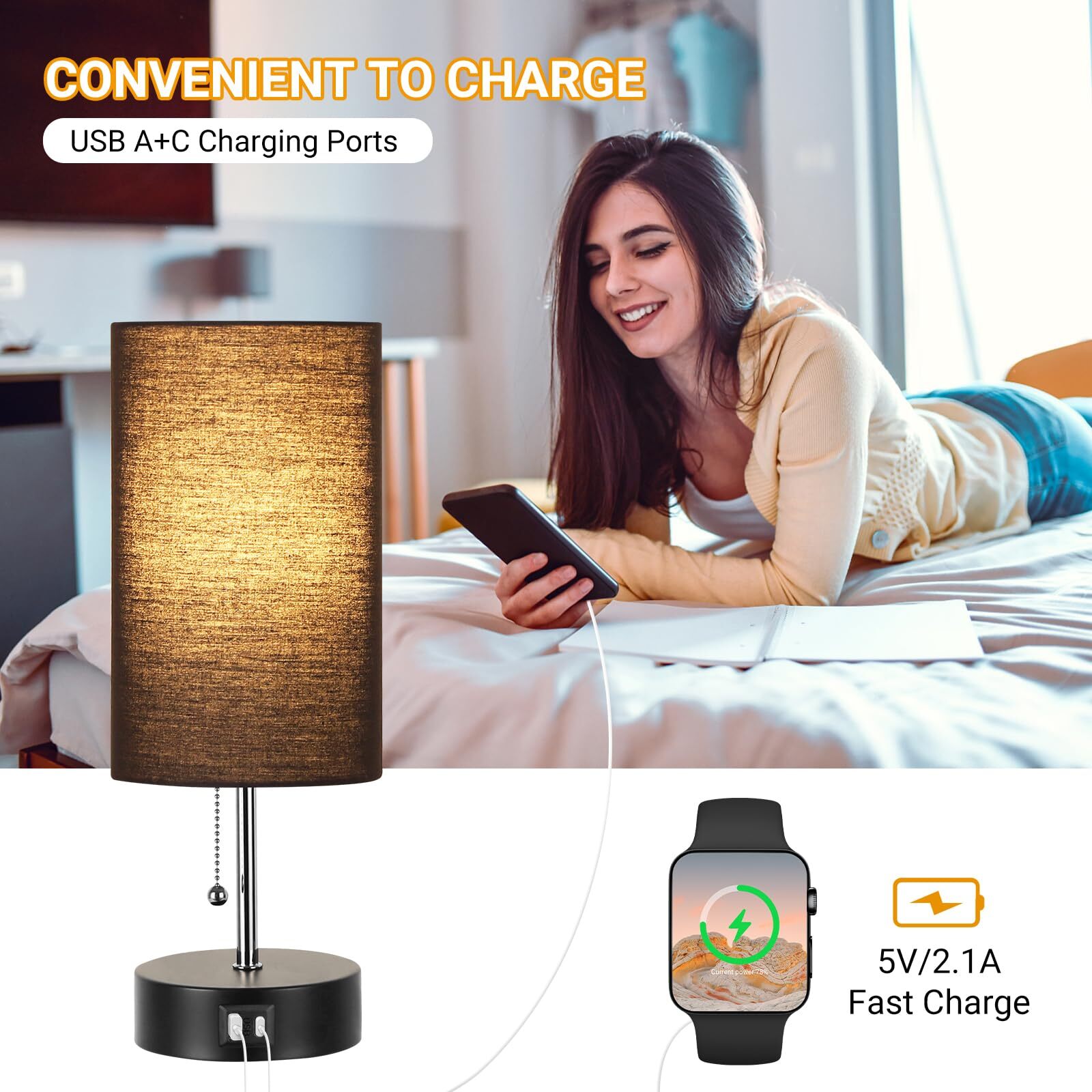 【3-Color Temperature Bedroom Lamp】The small desk lamp comes with a 9W LED light bulb, it has 3 color temperature modes (3000K/4000K/5000K) which can meet your different needs in different scenarios. You can change the light by pulling the chain. Different Modes creates a different atmosphere. 【USB A&C Fast Charging Ports 】The modern table lamp for bedroom euipped with USB A and C charging ports (5V/2.1A) for fast charging, getting your phones, humidifier, kindle, headsets, speaker and other electronics fully charged. And what the greatest advantage of our nursery lamp is that whether the lamp is on or off, these charging ports can still keep working. 【Free LED Bulb Included】 For your convenience, there is one free bulb in the package to save you from the trouble of purchasing bulb. The light bulb emits 3000K/4000K/5000K 800LM light with only 9 watts consumption, which is super energy-saving and environmentally friendly, greatly saves you electricity bills. What's most important is that the bulb has no flicker, no dizziness, and can protect your eyes efficiently. 【Minimalist Design for Home】 The USB table lamp with the minimalist design, makes it be a perfect addition to your home.The fabric shade and black metal base is perfect to decorate anywhere at your house. It's a great choice to take this night stand lamp as a gift for your friends, family. A perfect bed side lamp for living room, bedroom, study room, kids room, den, nursery. 【Eye Protection Glow】The gray lampshade is stylish and durable, and also it can soft the light radiation to protect your eyes and give your bedroom a soft tone. Our small table Lamp cteates a nice and comforting feeling in the house when spending time with your family as the linen fabric shade softens the light making it better for protecting your eyes.