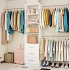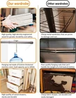 Product Description Creat a Work of Art for Your Closet wit Closet Systems. 5FT-8FT - 99" Wood Closet System, Dimension:99” L*14.8”W *81”H(when rods fully expanded). 4 Stainless Steel Hanging Rods - Super sturdy( Expandable Rods can be adjusted from 22" to 39.4"). 4 Shelves, 3 wooden drawers, ultimate the storage. Versatile Installation Ways- As you like. Multiple Installation Ways fits for 5ft -8ft Closet Room. You can install one side to become side closet. Shorten the expandable rods and cut shelving tower for small room. Adjustable Shelves, Cuttable Shelf Adjustable Shelves. 4*Shelves, 2 of them are height adjustable. 2pcs of the adjustable shelves are with 10 positions adjustable to fits all of your needs. Decoration, Folded Dresses, Handbags, Books, Storage Box, Jewelries can all be hold on shelves. Expandable Rods in Stainless Steel Expandable Rods - Size can be adjusted from 22" to 39.4" to fit many of the Cloak Room. Customizable and DIY Easily with the expandable Rods. Stainless Steel Rods - Super Sturdy, no bend. Cuttable Shelving Tower- DIY. closet system Baseboard Design. This closet system features an installed-in-front-of-baseboard design. Fit seamlessly in homes with baseboards. Fully functional, ensuring versatile usability. Deep Wooden Drawers 3 Large & Deep Drawers Made By Engineered Wood, not the Fabric kind. For underwear, stockings, folding dresses, privacy items. Drawer Dimension: 20.5"L*14.8"W*7.7"H. Previous page Next page A Work Of Art. Ultimate Your Storage. Long and Heavy load. Top layer storage- for Suitcases, quits on the top of side shelves. Expand your storage: All sort of accessories can find its space. Solid and Sturdy. Previous page Next page 3 Large & Deep Drawers Made By Engineered Wood, not the Fabric kind. For underwear, stockings, folding dresses, privacy items. Drawer Dimension: 20.5"L*14.8"W*7.7"H.