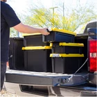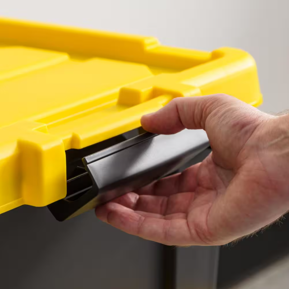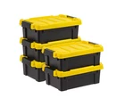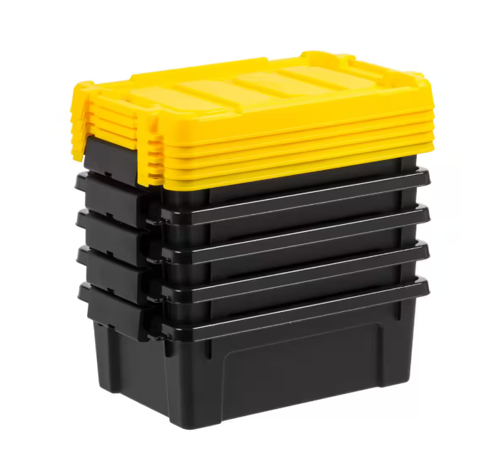 3 Gal Stackable Heavy-Duty Storage Totes Black w/Yellow Lids - Set of 5 Bins Stackable design maximizes storage space Locking lid protects contents from dust, dirt and moisture Ergonomic handles facilitate easy lifting About This Product The 3 Gallon Heavy Duty Storage Totes are designed to protect your items and is perfect for garage storage. The space-effective and stackable design makes this the perfect storage tote for camping gear, hunting equipment, first aid kit supplies, tools, job-site materials, and more! The grooved lid allows you to secure each bin with bungee cords or straps. This heavy-duty storage container is proudly made in the USA with durable BPA-free plastic. Protect your most valuable items with IRIS USA's Heavy Duty Storage Totes. Highlights Heavy duty construction: durable plastic construction for robust performance in tough environments Lockable lid design: provides added security to protect contents from dust, dirt, and moisture Secure latching system: ensures the lid stays securely closed, even when stacked Ergonomic handles: facilitate easy lifting and carrying Stackable design: maximizes storage space and organizational efficiency Sleek Finish: Offers a professional appearance suitable for any space. BPA-Free Material: Safe for storing personal items and household goods, ensuring peace of mind for you and your family. Space-Efficient: The slim design of these bins allows them to fit into tight spaces, making the most of your storage areas. Durable Construction: Made from high-quality, durable plastic that withstands daily use and heavy loads. Dimensions: outside dimensions are 18.1 in. (L) x 11.6 in. (W) x 6.5 in. (H) and interior dimensions are 14 in. (L) x 8.8 in. (W) x 5.6 in.