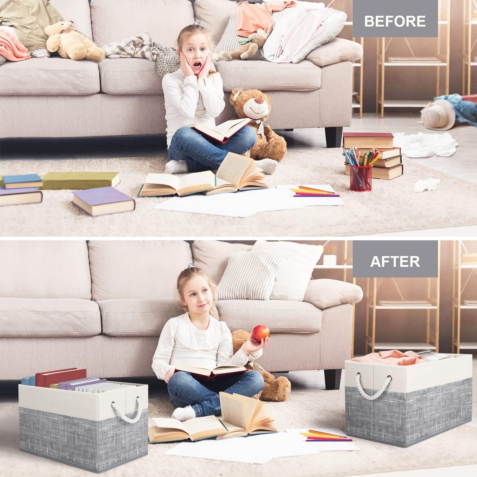 Premium Fabric: The storage bins are made of stiff cardboard on the bottom and all sides walls so that the organization bins stand on their own, even when empty; sturdy materials ensure that these storage containers are strong and long-lasting Spacious Capacity: Fabtotes storage basket measures 15" x 10" x 9.5"; this large size enables you to store a wide variety of items to keep your home tidy and organized Reinforced Handle: The bins for organization come with two sturdy rope handles made of soft rope to easily pull or lift the bin.; the organizer bin is stitched with a metal ring where the handle is connected to ensure durability and tear resistance Collapsible Design: The fabric storage cubes can be folded flat when not in use to save space or transport; fabric baskets are easy to clean, simply dust with a soft dry cloth Multi-Purpose: The basket organizer is a perfect option for organizing toys, magazines & books, CDs, clothes & towels; the collapsible storage cubes can be easily stored in closets, drawers, shelves, etc