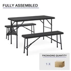 Faux Rattan Design - This folding table and chairs are crafted from faux woven rattan, featuring modern and stylish style. Perfect for decorating your patio, poolside, balcony, garden and porch. Ideal for both indoor and outdoor use, providing a place for you and your friends to enjoy and relax. Lightweight and Portable - The folding design of this folding table set allows for quick and easy storage. When folded, the table measures 47.2 x 24 x 1.57 inches and the benches measure 40.2 x 10 x 1.54 inches. This makes them easy to transport and store in a car trunk. With this set, you can enjoy a café experience right outside your door, making it an ideal solution. Durable and Easy to Clean - This folding patio table set is highly rust, water, and abrasion resistant! The galvanized iron frames are coated with an anti-rust layer to prevent corrosion and decay. The tabletops are also made from a waterproof HDPE material, providing great support while being easy to clean. Sturdy Weight Capacity - The folding table and chairs set are constructed from heavy-duty steel frames with snap-lock mechanisms for stability during use. When set up it can comfortably accommodate 4 people. Recommended weight capacities are 400 lbs for the table and 550 lbs per benches. No Assembly Required - The bistro set requires no assembly, taking just 20 seconds to fully unfold and be ready for use. [With a Mesh Bag] - For containing small items and keeping the tabletop tidy.