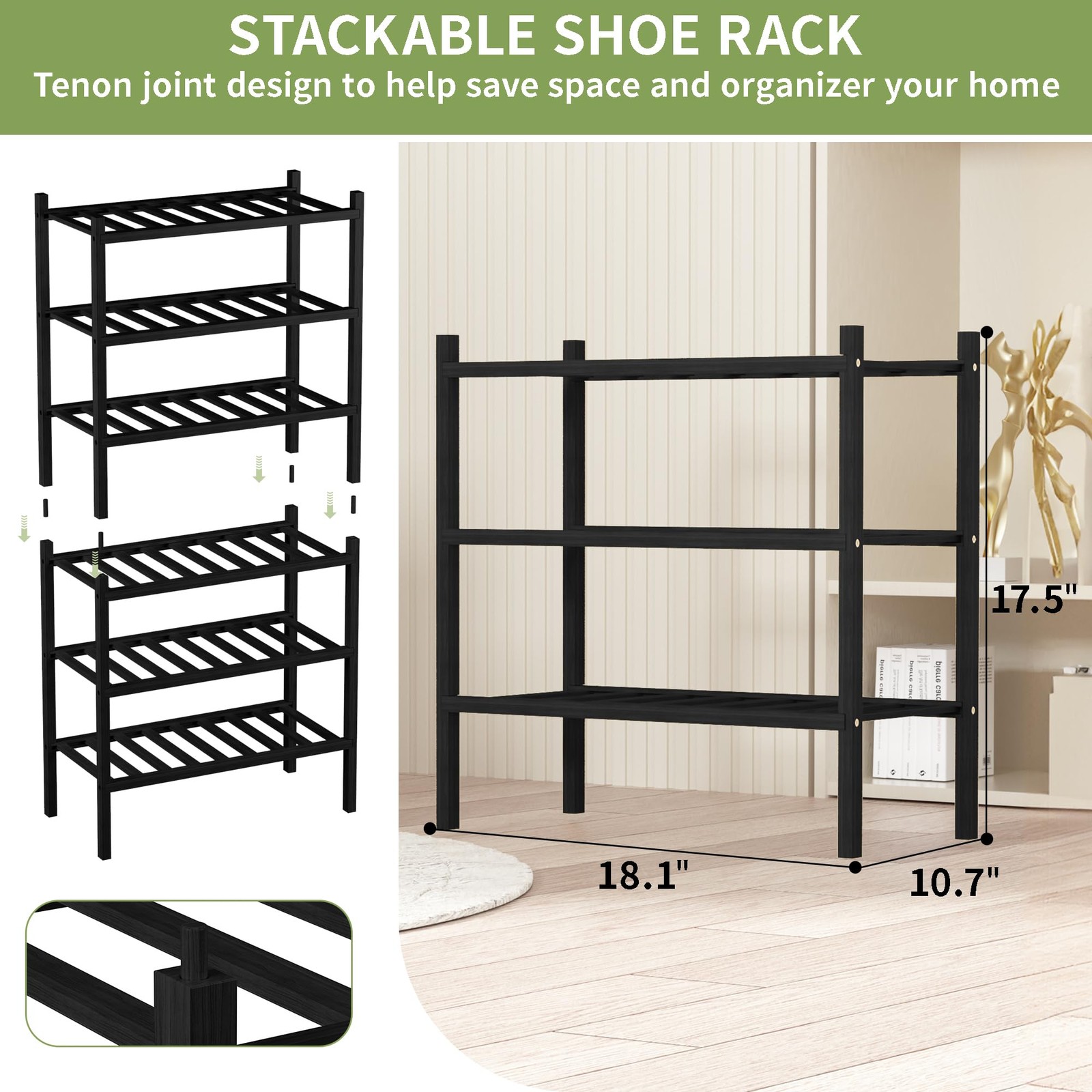 【Preferred high-quality bamboo】The entryway small shoe rack is made of eco-friendly bamboo for an elegant look and very durable. After high temperature carbonization,not easy to crack and deform. Due to the properties of bamboo, bamboo boards are stronger and last longer than wood. In addition, bamboo is a renewable resource and is naturally environmentally friendly. 【Stackable Design 】Each type of narrow shoe rack is stackable, and the combinations are constantly changing. Two 3-tier shoe rack units can be stacked into a 6-tier shoe rack, and three 3-tier shoe rack units can be stacked into a 9-tier shoe rack. You can determine the height of the modular shoe rack yourself. 【Easy to Assemble】We offer all the accessories you need for a closet shoe rack. You can assemble this shelf in just a few simple steps. Assembly instructions are very easy to follow.You can install it in only 10 minutes. 【Multifunctional Storage Rack】This cute kids shoe racks keeps your shoes organized.Natural bamboo texture is suitable for almost any home decoration.Also, this floor shoe rack has multiple uses to help you organize everyday items in your bathroom, living room, office, kitchen, such as toiletries, towels, clutter, decorations, books, plants, shoes and small appliances. It maximizes space, simplifies organization, and maintains an uncluttered environment. 【Satisfactory After-sales】If you encounter problems during installation and use, or any dissatisfaction with the wooden shoe rack, please feel free to contact us, we can provide professional guidance at any time. If there are quality problems after receiving the goods, we can accept the return and exchange unconditionally after we confirm.