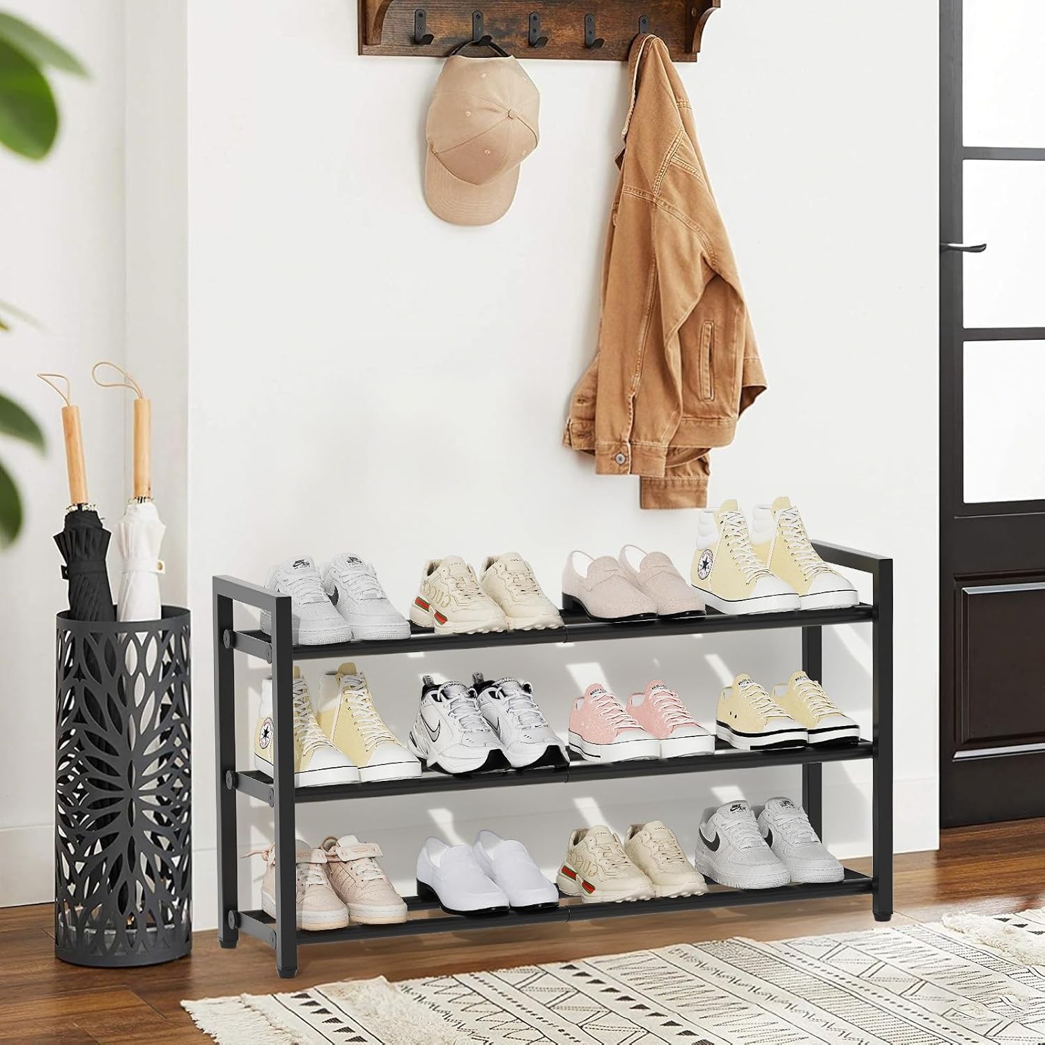 This shoe rack is a game-changer for small spaces! The adjustable width makes it super versatile—fits perfectly in my closet and entryway. No tools needed for assembly, and it holds up to 12 pairs of shoes without wobbling. Sturdy, space-saving, and totally worth it!