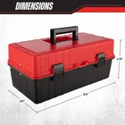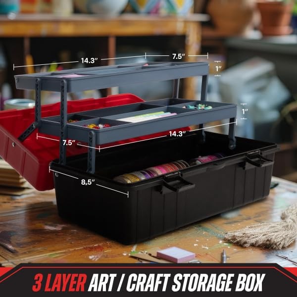 3-TIER TOOL ORGANIZER - This small tool box is big on storage capacity, with an open bottom and 2 storage trays divided into compartments that will make it easy to organize a variety of tools, hardware, and other items of different shapes and sizes. PORTABLE TOOL BOX - This travel-ready 15.94-inch-long tool organizer box weighs just 4.2lbs and has a built-in handle for easy carrying. Simply pack this empty tool box with all your essentials and you’re ready to complete repairs at home or on the go. DURABLE CONSTRUCTION - Our tough plastic organizer box is made from food-grade polypropylene with 2 secure latches, for a sturdy toolbox organizer that is water-resistant, dust-proof, and light-proof, with a stable base that resists tipping when open. MULTIPURPOSE USE - You can also use this small toolbox as craft box organizer or art supply storage case, as a medicine organizer box, nail supply organizer, tacklebox, hair accessory organizer, or hobby box for any other type of small items. PRODUCT DETAILS - Materials: Polypropylene. Dimensions: (L) 15.94” x (W) 8.46” x (H) 7.09”; Tray: (L) 14.25” x (W) 7.5” x (H) 1”; Bottom: (L) 15” x (W) 7.4” x (H) 4”; Capacity: 17.6lbs. Craft Box Trays Have 6 Fixed Compartments. Color: Black and Red.