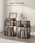 【3-TIER DESIGN】This bedside table features a tabletop for your record player and 2 open shelves that can hold up to 100 albums. Enjoy a tidy and organized music area 【EASY ASSEMBLY】This record player stand comes with detailed instructions and labeled parts, making it a breeze to assemble in just 6 simple steps 【VERSATILE USE】This turntable stand doubles as a side table, making it a versatile addition to your living room, bedroom, or study. Enjoy your afternoon tea or store daily essentials with ease 【STURDY AND STYLISH】Crafted from robust particleboard and steel, this couch table is built to last. The combination of rustic brown and black colors creates an industrial look, adding a touch of vintage charm to your decor 【THOUGHTFUL DETAILS】The dense mesh prevents items from falling off, while the removable U-shaped dividers at the bottom allow you to customize your storage space to fit your needs