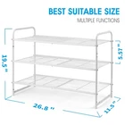 What does this DIY shoe rack have to offer? Stackable and Expandable: This 3-tier shoe rack provides shelves for keeping flats, boots, high heels, kids’ shoes. Two sets can be stacked or placed side by side to create a large capacity shoe rack and fit your space. Versatile Storage Shelf: You can place this rack anywhere you want, such as in the entryway, closet, garage, or living room; also great as a storage shelf for dry food, books, games, toys, craft supplies, etc. Will you find any more possible uses? Just find out yourself with this versatile utility rack. Specifications: Color: White Material: Metal Product Size: 26.8" * 11.4" * 19.5" Weight: 5.5lbs Max. Load Capacity of Each Shelf: 22 lb Package Contents: 1x 3 Tiers Shoe Rack 1 x Assembly Manual 1 x Allen Key 4 x Metal Connectors ( for stacking ) 【3-TIER SHOE RACK】This shelves fit boots, high heels or slippers and hold 9-12 pairs of shoes. 【Multifunctional】In the kitchen, set the kitchenware and cutlery. In the living room, the shelves can hold sundries.Put it in the closet and keep the clothes neat. Make the utility room looks cleaner. 【STACKABLE AND EXPANDABLE FOR DIY】2 sets can be stacked vertically to get a complete 6-tier shoe rack or bridged horizontally to expand the unit. 【DURABILITY】 Made of thickened metal tube with power coated finish which is smooth and with strong corrosion resistance. 【EASY ASSEMBLY】 Simple structure design makes it very easy to assemble. USPTO: 00939253