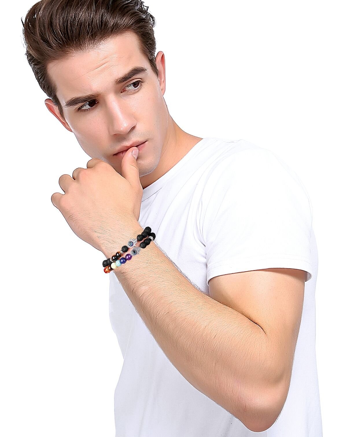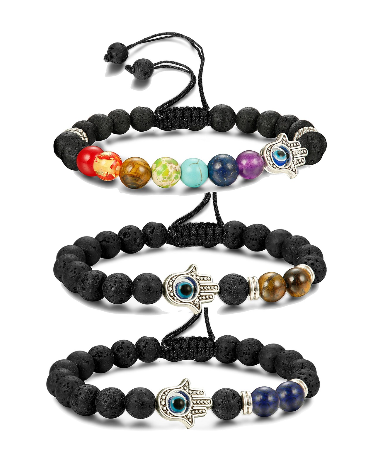 Description --ideal choice EVER 's core philosophy is the manufacture and sale of a modern,fashion, versatile,and affordable jewelry collection. 's aim is to provide the suitable jewelry for our customer which can be wear at anytime ,anywhere. 3pcs Evil Eye Bracelet Lava Stone Beads Essential Oil Diffuser Bracelet For Man Women 3pcs come as a set, What makes this bracelet set better? *It is a good gift for your lover,family,friend. Good for going party or banquet. . *The bead bracelet inner length is 6.7 inches and it is elastic.Fits Most of the Size. . *You can drop your favorite oil on the lava stone so that you can smell the essential oil all day long. *Set of 3 Bracelets. Each Handmade bracelet has its own unique natural stone.Healthy and Comfortable. Service and Warranty 1.1st principle:Customer first. Contact us if you have any questions.We will get back to you in 24 hours.Don't hesitate to contact! 2.100% new condition and 100% sterner inspection.Don't hesitate to try! 3.90-Day Money Back Guarantee or Exchange.Don't hesitate to buy! Product Features: Balances all chakras. Lava Rocks are porous making them perfect for absorbing and diffusing Essential Oils. Add a drop of your favorite oil, let it soak and enjoy its aromatherapy benefits Perfect for meditation,Elastic malas are typically used to focus your attention, to keep your mind off of the distractions of thought.Alloy Hamsa hand charms with evil eye decor implied protection for you. Beads are volcanic stones that are corrosion resistant and absorbent.made of high quality, can withstand years of daily use. Each Handmade bracelet has its own unique natural stone.Healthy and Comfortable. 3pcs come as a set.Stone Diameter:8mm.Bracelet Length:7Inches.The right size is more comfortable to wear. Easy to Fit to Your Wrist.3 different bracelets give you a different chioce and feelings. 240 DAY GUARANTEE POLICY:If you are not satisfied with the products,We give you Money Back or Exchange Guarantee.