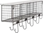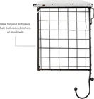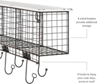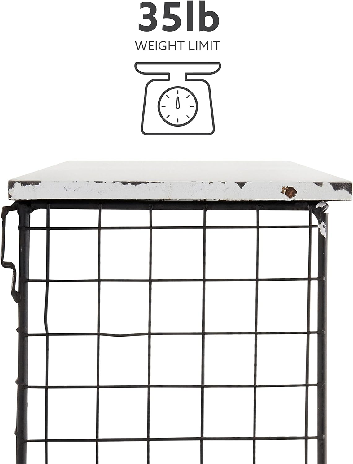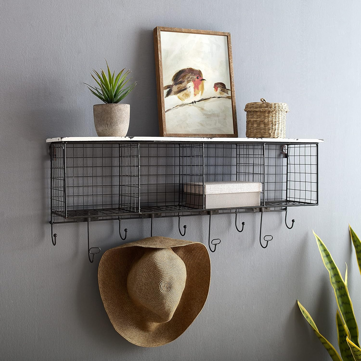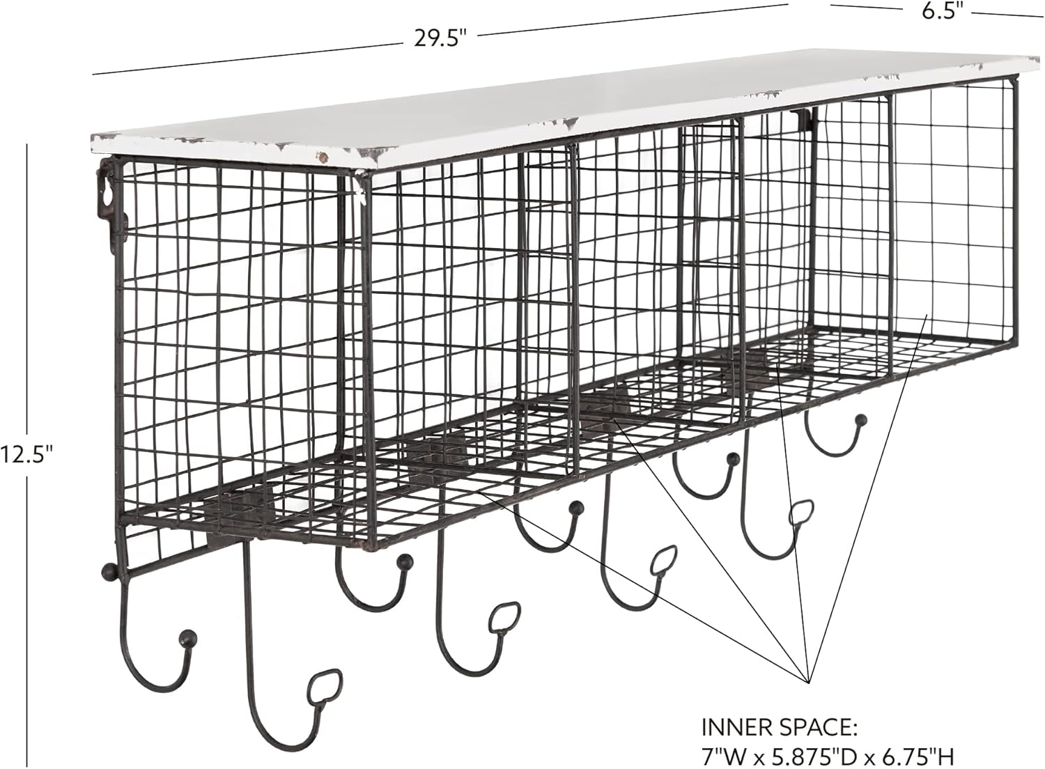 Hangs on the wall for space saving storage Perfect for an entry, hall or office Grid metal material White MDF distressed top Nine storage hooks 4 Storage cubes The four cubby wall shelf will add storage to an area while saving valuable floor space. Four grid style metal cubbies provide room for storing and displaying a variety of items. Nine storage hooks allow you to hang coats and bags. A white distressed top provides an additional area to display items. Perfect for an entry, office or hallway.