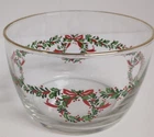 This set of 4 vintage Libbey salad bowls features a festive Holly Berry pattern, making them perfect for a Christmas occasion. The bowls are made of clear glass with red and green accents, showcasing a round shape and a wreath design. These charming bowls are ideal for serving desserts or salads during the holiday season, adding a touch of festive flair to any table setting.